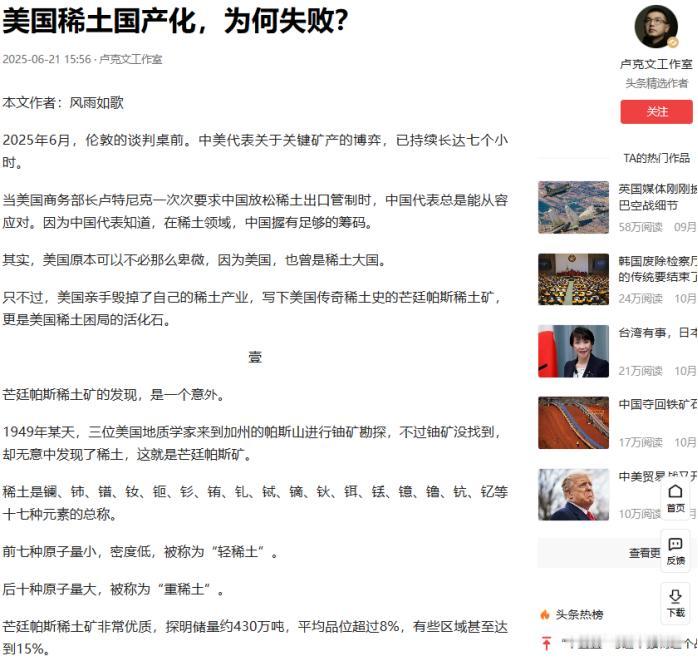 美国人只要咬紧牙关,就可以把稀土提炼出来,正确吗?答案是肯定的。稀土技术不是很难,每个国家都可以从开采到提炼全过程做出来,为什么这些国家都没有去做呢?因为没有规模。 稀土那点技术门道,说穿了就是把矿石里的十七种元素分开提纯,算不上多高深的学问,各个国家只要肯花点功夫钻研,从挖矿到提炼的整套流程都能摸明白,但真正让他们望而却步的,就是没规模撑不起来。 美国的芒廷帕斯矿就是最典型的例子,这座探明储量430万吨、品位最高达15%的优质稀土矿,曾在80年代末供应全球90%以上的稀土需求,从开采到加工的全产业链一度完整且成熟。 可如今即便有政府大力扶持,2024年产出4.55万吨稀土精矿的它,自建冶炼线全年仅能产出1294吨镨钕氧化物,不足总产量的3%,剩下的绝大部分仍得运到中国加工。 不是美国企业不想自己炼,实在是单条冶炼线的投入和产出根本不成正比,MP Materials豪赌10亿美元新建厂房和设备,规划的年磁体产能也才1000吨,要到2026年底才能正式投产,这样的规模连自家矿山的原料都消化不了。 规模上不去,首当其冲的就是成本问题。中国企业早形成了“南重北轻”的双寡头格局,控制着全球92.3%的稀土冶炼分离产能,85%的开采指标和90%的国内冶炼产能都握在两大集团手里。 这种体量下,单吨加工成本能压到极低,反观美国企业,分离工艺还得依赖中国专利授权,单吨加工成本比中国高出30%-40%。 江西赣州一个年产2800吨混合稀土氧化物的项目,总投资就要1.8亿元,要是想建能匹配芒廷帕斯矿产量的冶炼厂,投资额得是这个数字的十几倍,没有持续的海量订单支撑,这笔钱投进去就是无底洞。 设备和产业链配套更受规模限制。稀土提炼离不开电解槽、高精度萃取机这些专用设备,中国早成了全球主要供应国,而美国的相关设备厂家早就集体断层,连芒廷帕斯矿重启都得用大量中国设备。 更关键的是稀土产业得形成“采矿-冶炼-永磁材料-终端应用”的完整链条才算真正落地,中国企业不仅能提炼氧化物,还能往下游延伸制造磁体,直接供应新能源汽车、军工等终端市场。 美国现在连冶炼环节都没撑起来,下游磁材制造刚起步,没有终端产业反哺,冶炼厂就算建起来也只能卖初级产品,利润薄得可怜,自然没人愿意扩大规模。 资源结构也让规模扩张难上加难。稀土分轻稀土和重稀土,军工等高端领域急需的重稀土,美国连有价值的矿藏都没有,更别提分离提炼能力。 就算能从加拿大、澳大利亚这些盟友手里拿到资源,跨洋运输的成本又得叠加在冶炼成本上,进一步削弱竞争力。 中国不仅自身有4400万吨储量,占全球近一半,还通过参股整合了缅甸、澳大利亚等海外资源,原料供应的稳定性和成本优势,是小规模国家根本比不了的。 全球市场就这么大,中国企业已经靠着规模效应把价格和技术标准都立住了,其他国家再想进场分蛋糕,要么得接受更高的成本卖不动产品,要么就得砸钱亏本扩产,可没哪个企业愿意做这种赔本买卖。 美国政府从特朗普时期就开始扶持稀土产业,又是拨款又是推动政商合作,折腾了这么多年,本土冶炼能力还是没起来,说到底就是规模这道坎迈不过去。 没有足够大的产能消化原料、摊薄成本、支撑产业链,就算把技术图纸摆在面前,也只能看着别人做。