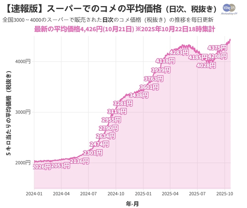 在2025年5月小泉进次郎出任农相后,日本大米价格一度有所回落,但从8月中旬左右开始再次进入上涨阶段。到10月21日,日本大米相关均价达4426日元(约合人民币207元),再创新高。