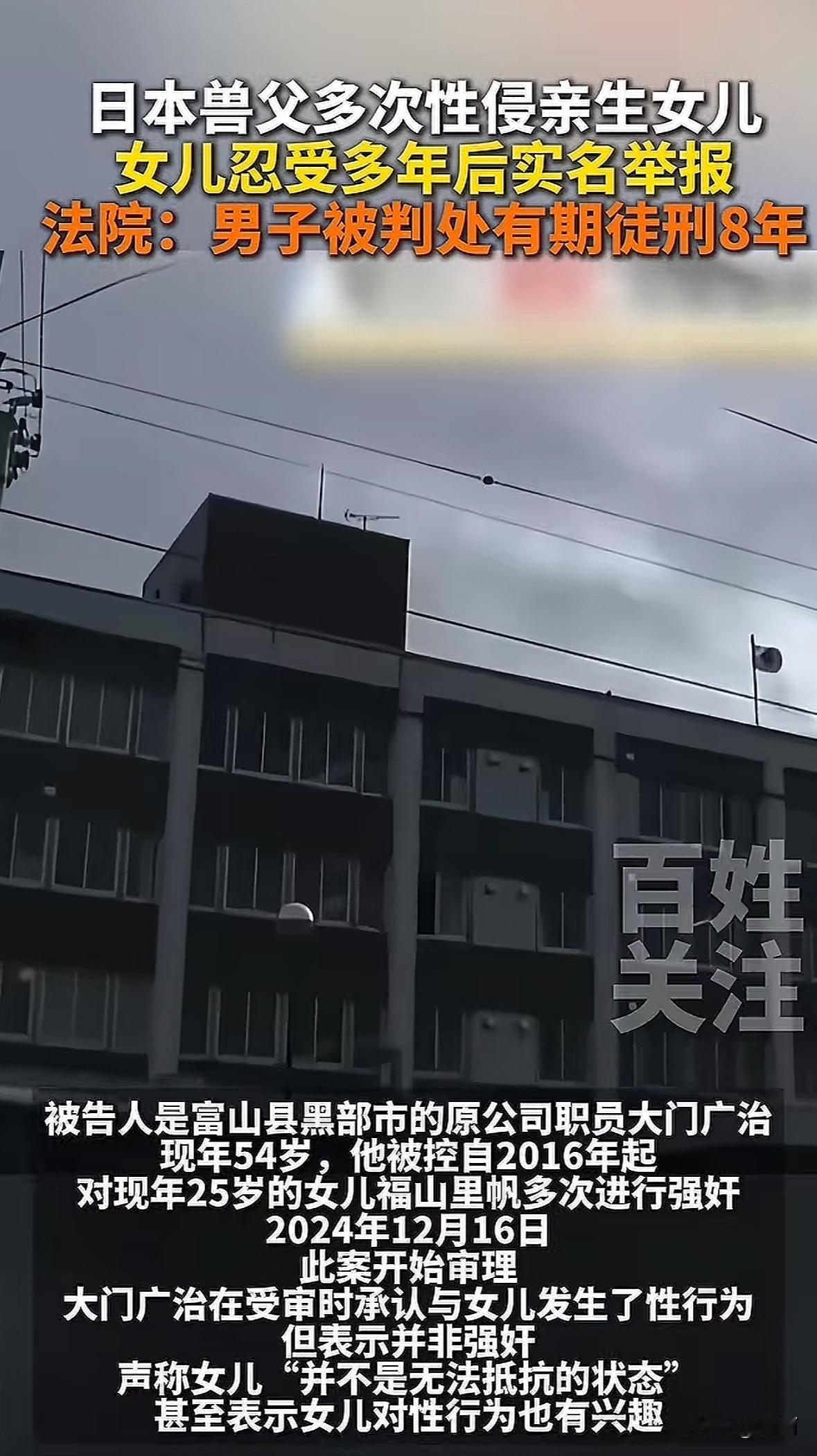 日本富山县54岁的大门广治,从2016年起性侵亲生女儿福山里帆。当时里帆刚上初二,被父亲以按摩为由强行侵犯,之后伤害持续到高二,共8次左右,父亲还一直让她保密。 2024年3月,25岁的里帆实名开记者会揭露恶行,引发热议。年底开庭时,大门广治承认发生关系,却狡辩女儿不是无法抵抗,甚至说她有兴趣。妇科医生作证称里帆身心伤害极重。 2025年10月,法院判大门广治8年刑,认定其行为卑劣,里帆供述可信。里帆说社会认可了她,想做其他受害者的光。 这案子戳破了家丑不可外扬的遮羞布,里帆的勇敢太难得。但8年刑期对应多年伤害,还是让人觉得轻了,希望能推动对这类罪行的更严惩治和对受害者的保护。