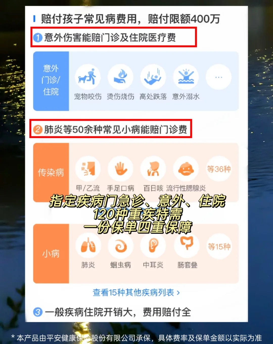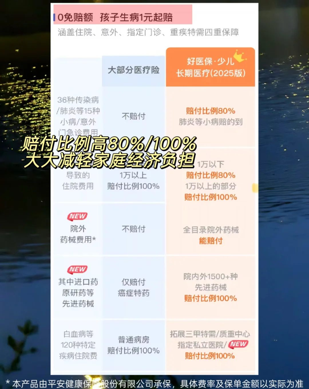 基础保障更是广泛覆盖儿童高频医疗场景:不仅包含甲乙流、肺炎、手足口病等 51 种指定疾病,门急诊赔付比例80%。意外受伤去门急诊花的钱也能赔,住院1万元以下报销80%,1万元以上的部分报销100%