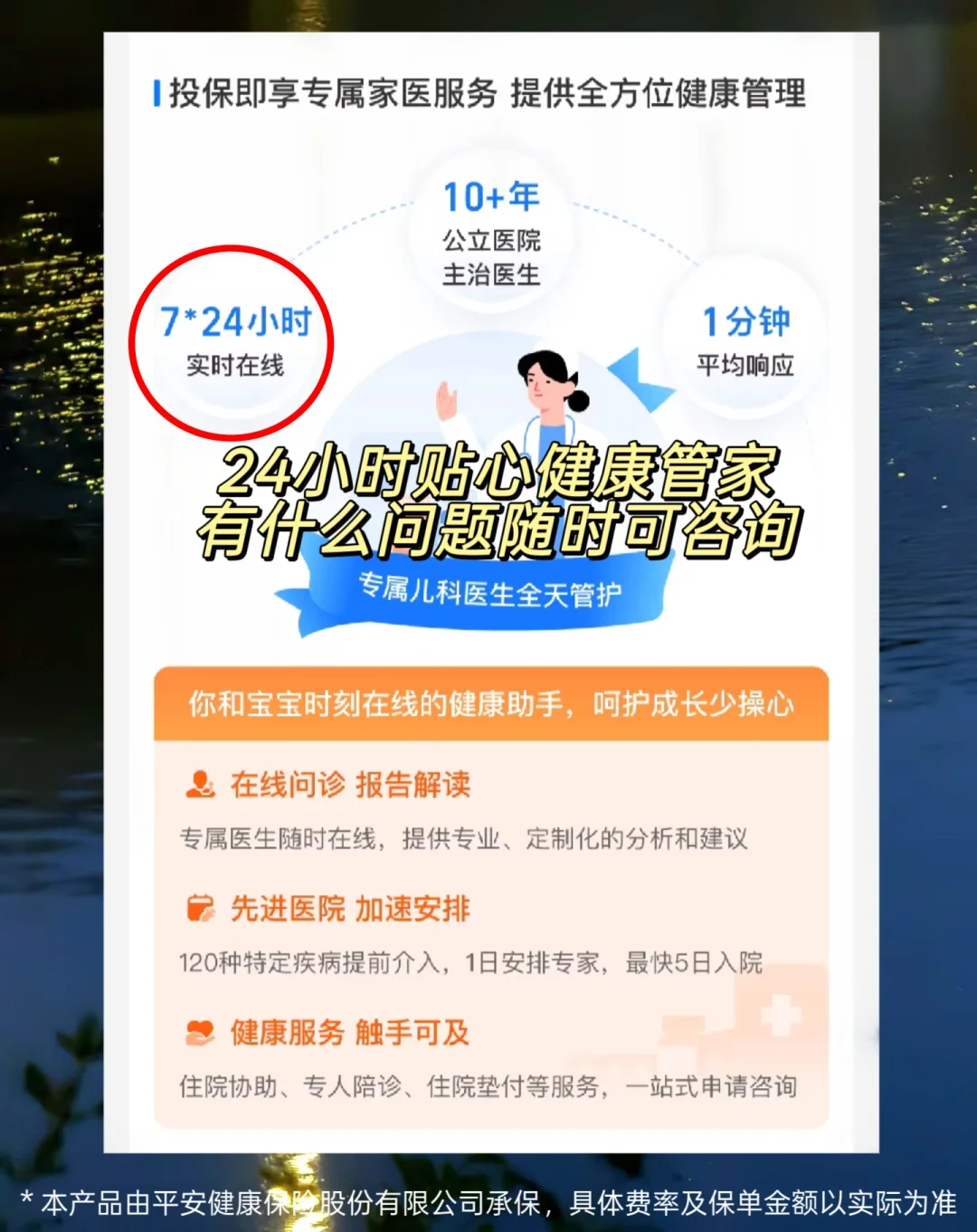 投保成功后立享7×24 小时专属家医,孩子日常遇到小病小痛,可随时进行线上咨询