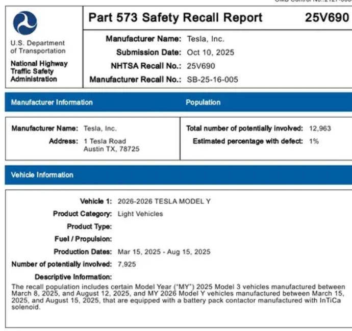 特斯拉在美国宣布召回 12963 辆汽车,涉及 2025 款 Model 3 和 2026 款 Model Y 车型。召回原因是车辆配备的电池组存在连接故障风险,可能导致行驶中动力突然丧失。受影响车辆的生产时间集中在 2025 年 3 月至 8 月,其中 2025 款 Model 3 为 3 月 8 日至 8 月 12 日生产,2026 款 Model Y 为 3 月 15 日至 8 月 15 日生产。针对该问题,特斯拉将为车主提供免费的电池组接触器更换服务。