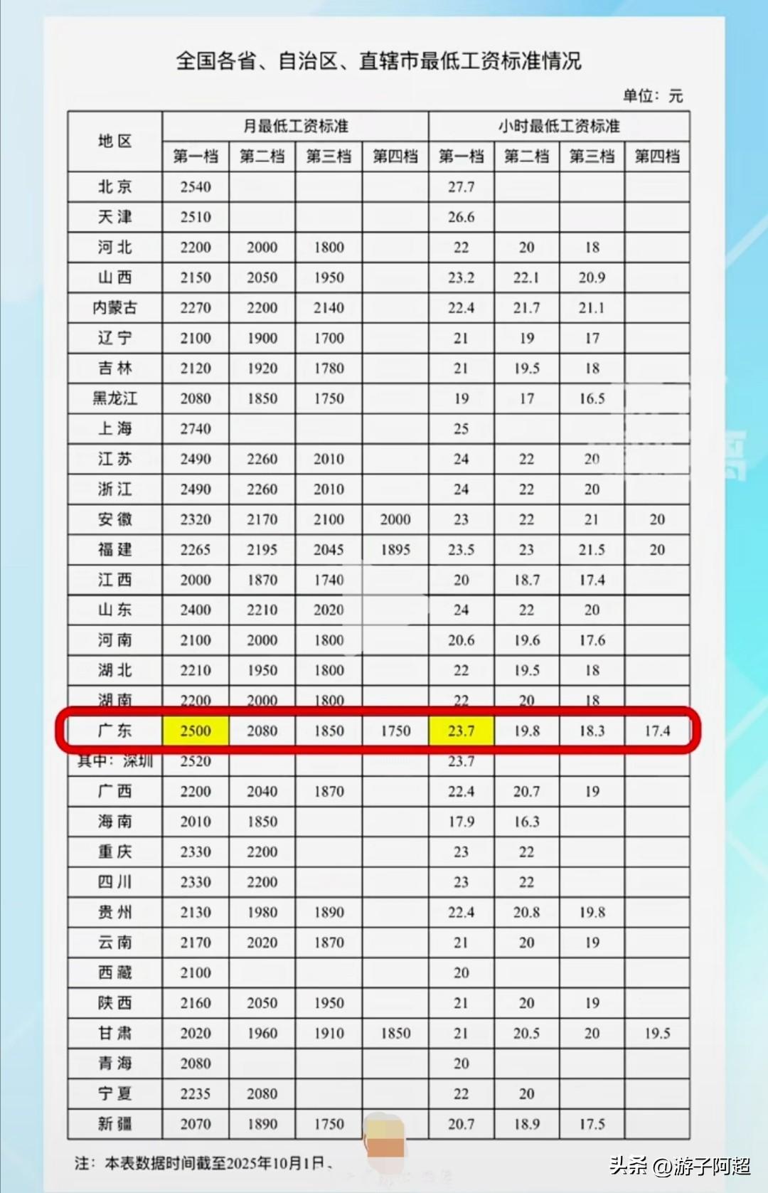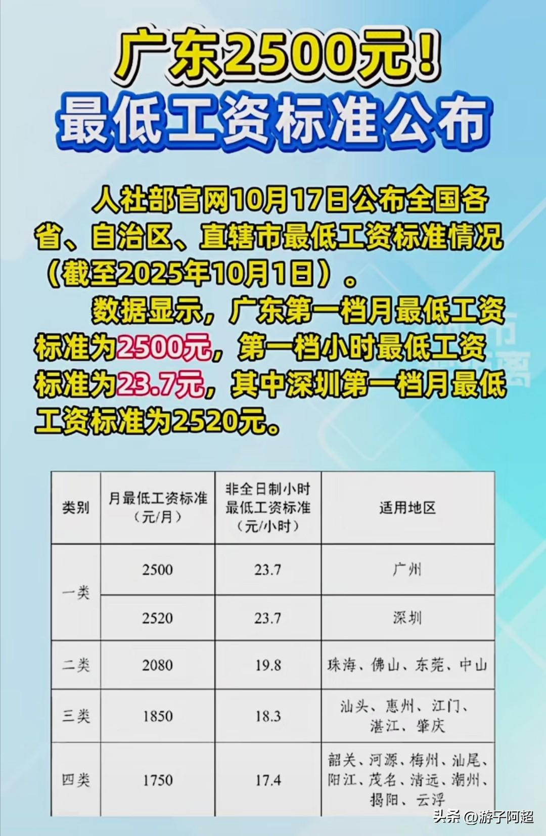 2025年10月17日,人社部公布了全国各地的最低工资标准。 广东省的最低工资标准分为四档,其中广州、深圳单独列为一档,最低工资标准分别为2500元和2520元。东莞属于二档,标准为2080元。 此最低工资标准,指的是劳动者在法定工作时间内所能获得的最低劳动报酬标准。