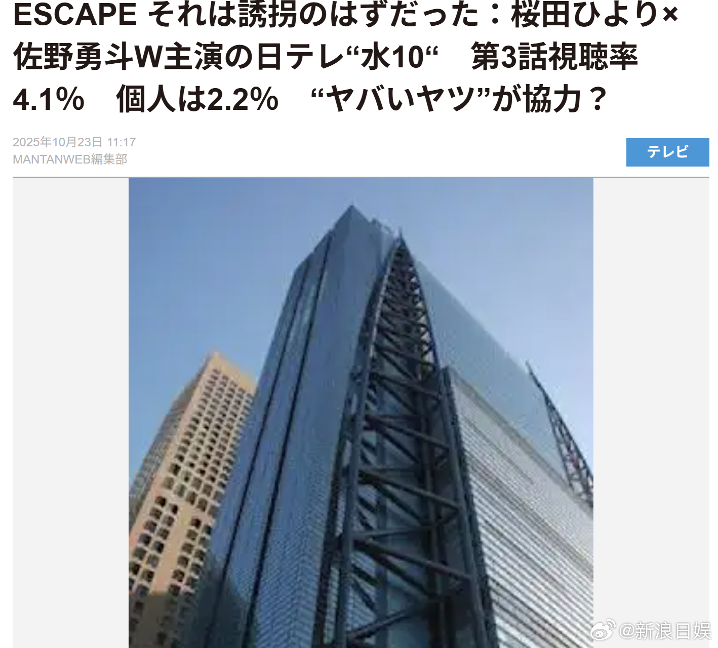 海外影视速递 樱田日和与佐野勇斗双主演的NTV水10新剧《ESCAPE 这本应是绑架案》于10月8日开播,第三集世代收视率为4.1%、个人收视率为2.2%。