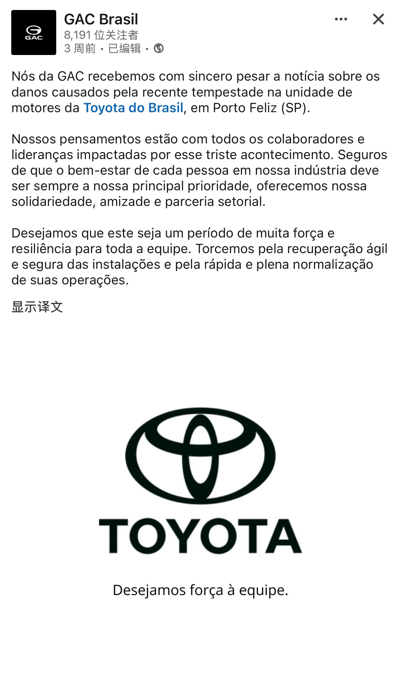 广汽就丰田巴西发动机工厂遭受风暴袭击事件发布的官方慰问信。
