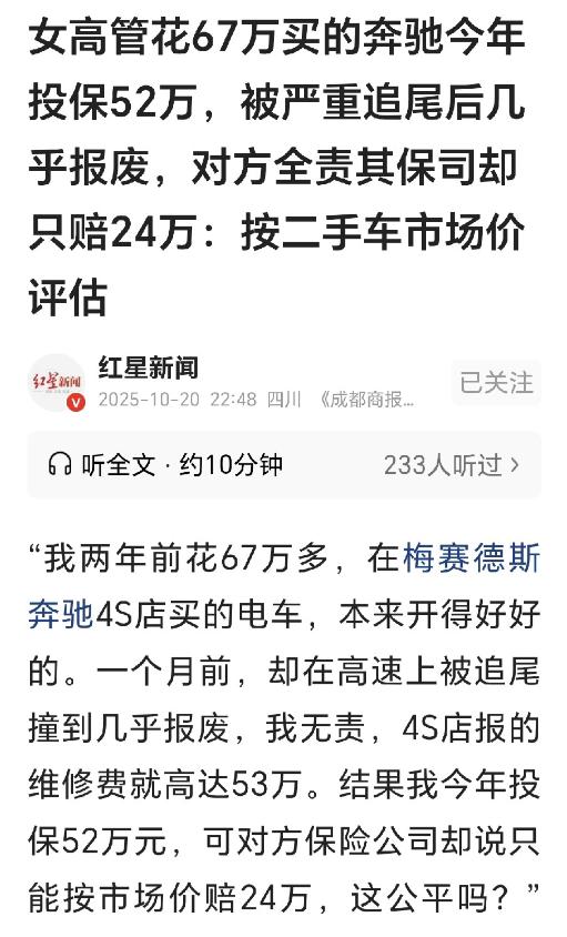 湖北武汉,一名女子花了67万元从奔驰4S店购入一辆电动车,开了两年,按52万元保额投了车损险。谁知上高速被追尾,车辆损毁严重,三只气囊同时爆开,对方负全责。可等到理赔时,她却发现保险公司只愿赔24万元。她愤然申请代位追偿,却被理赔员的一句话点醒——这笔“省下来的钱”,才是真正的亏。 8月31日下午,张女士驾驶这辆白色奔驰电车从河南返回武汉。行驶到G0424京武高速黄陂段时,一辆小轿车突然从中间车道猛烈追尾。巨大的冲击力让车辆打横,失控地撞上高速护栏。嘭——伴随着气囊爆开的声响,整辆车几乎报废。张女士头晕目眩,从驾驶室艰难爬出,看着被撞得面目全非的车辆——右后方车体缺口,充电口外露,电机裸在空气中,前脸全毁,三个安全气囊全部弹出。 警方随后赶到,勘查结果显示:张女士无责,对方全责。这让她多少松了一口气,认为至少能得到足额赔偿。可几天后,对方保险公司给出的赔偿金额,竟只有24万元。 张女士当场懵了。她的车购入价67万,买保险时投保额是52万,对方全责,为何只赔24万?她多次拨打对方B保险公司电话,对方理赔员回复道:“我们是按照事故发生时车辆的二手市场价值计算的。”张女士不接受,质问:“我三月份刚买的保险,八月份出事,凭什么不按保额赔?”理赔员冷静地解释:“这辆车是4S店的试驾车转让给您的,属于过户车辆,也就是二手车。理赔只能按事故时的实际价值算。” 原来,两年前张女士通过熟人关系,从奔驰4S店以“试驾车转让”形式购入此车。她签了转让协议,虽然发票金额仍是67万多,但车辆所有权已从公司转至个人。也就是说,车辆在法律上确属“二手车”。 这场“省下几万元”的交易,成了如今理赔受限的根源。张女士随后提出让自己投保的A保险公司先行代位赔偿,再由A公司向B公司追偿。然而A公司给她泼了冷水:“我们可以先赔,但金额也得在B公司认可范围内。若我们多赔,对方不认账,这笔钱就追不回来了。” 张女士陷入两难。她以为保险“保多少赔多少”,没想到实际理赔却是“值多少赔多少”。法律上,这种争议十分典型,涉及保险理赔的损失填补原则。《民法典》第1184条明确规定:“侵害他人财产的,财产损失应当按照损失发生时的市场价格或者其他合理方式计算。”这意味着,理赔金额应以车辆在事故当时的实际市场价值为准,而非购买价或投保保额。 换言之,保险不是保赚钱的,是保回原状的。保险的核心功能是补偿损失,而非让被保险人获利。因此,对方保险公司以二手市场价评估24万元,并无明显违法。 张女士投保时的保额52万元,是根据购车价折旧后估算的数值,但两年后车辆贬值,再加上“试驾车”属性,其市场价早已不足52万。于是,B保险公司按市场价定损24万,符合法律中“损失填补”原则。 然而,争议的焦点仍在于:试驾车算不算二手车?理赔员给出的答案是肯定的。因为从法律角度,只要车辆完成所有权转移登记,即视为“二手车”。无论车况如何、里程多少,只要非新车出售,理赔就按二手车估值。 不少车主在买“内部车”“试驾车”时,都忽视了这一点。车辆表面崭新,但过户记录会直接影响保险理赔及市场残值。理赔员那句“只要过了户,就算二手车”,其实正是依据《保险法》第55条的原则:保险标的必须以事故时的实际价值作为赔付依据。 那张女士还有没有办法维权?当然有。她可以申请第三方车辆鉴定,由专业评估机构重新核定事故时的市场价值。如果鉴定结果明显高于24万元,可要求保险公司重新定损;若协商无果,还可提起民事诉讼,由法院裁定。 张女士当初为了省钱买试驾车,却忽视了过户车辆的法律属性。她买保险时虽填了高额保额,但在理赔环节,保险公司依法只能按“事故时价值”赔偿。最终,她看似赚的几万元优惠,反而成了赔偿时的“隐形损失”。 保险专家指出,这类纠纷的根源在于车主对保险合同理解不足。许多人误以为保额就是赔额,实际上,保险条款中早有明文规定——“保险赔偿以实际损失为限,不得超过保险金额。” 有律师分析指出,如果张女士能在购车时明确签订新车销售合同,且发票主体为制造商或经销商,车辆即视为新车,理赔金额可能会大幅提高。但她签的是试驾车转让协议,属于二次销售行为,这在法律上确属二手车性质。 从另一个角度看,这类事件提醒消费者——买车不是只看价格,更要看合同属性。一纸“转让协议”,可能省了几万,也可能让你在理赔时损失几十万。
