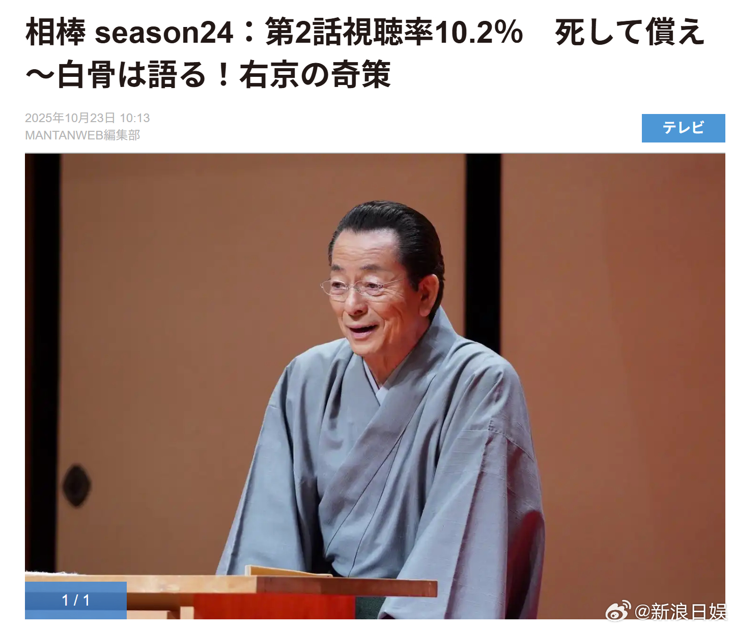 海外影视速递 水谷丰主演的朝日台电视剧《相棒season24》第二集世代收视率10.2%,个人收视率5.8%。