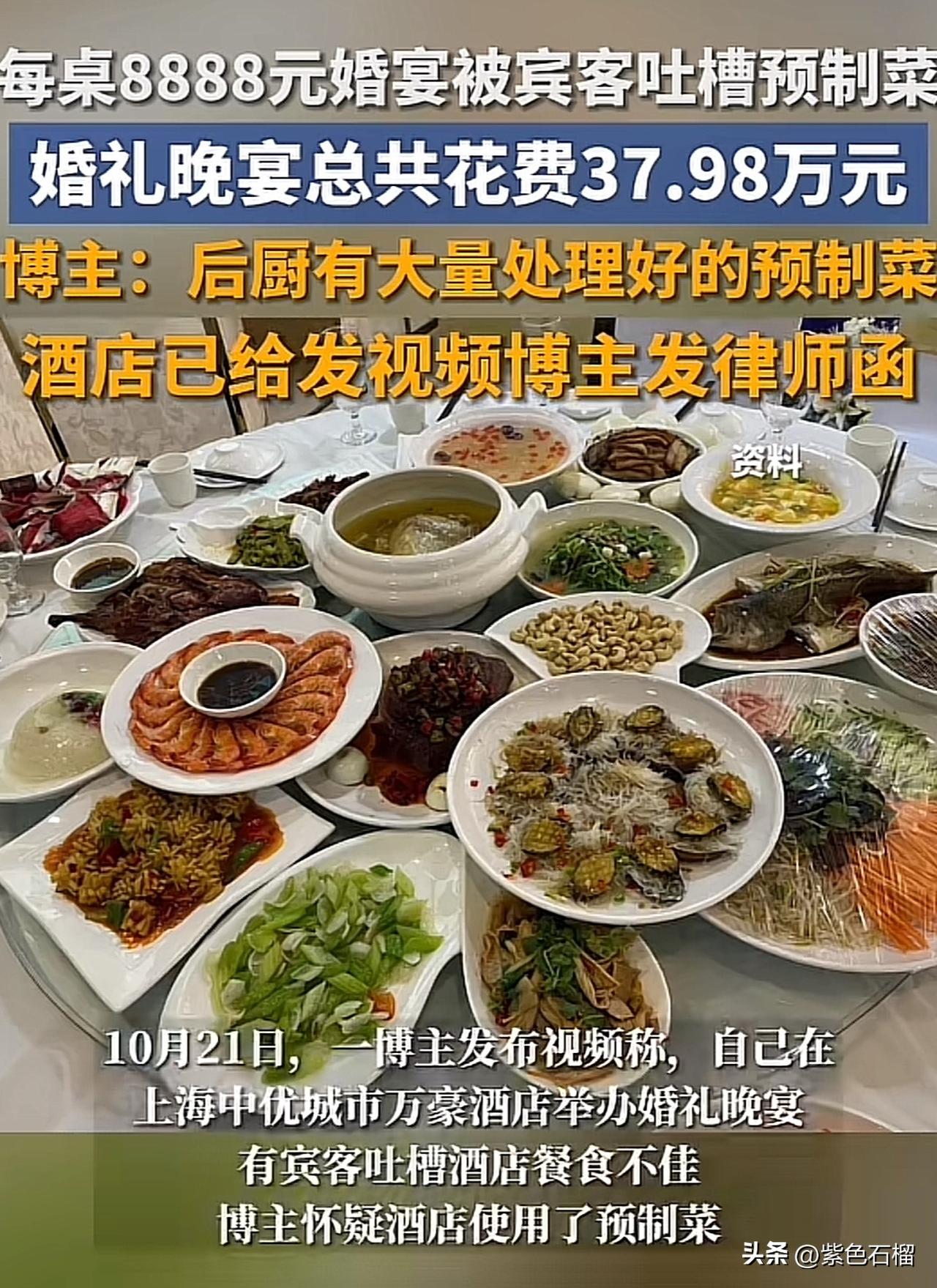这也太恐怖了! 这下可不光上海老百姓知道,全国人民都知道了了!这酒店简直比西贝还不靠谱啊! 10月21日,一女子反映,她在上海万豪酒店预订了价值37万多元的酒席,每桌酒席价格为8888元。结果你能猜到吗?酒席上的菜品100%都是预制菜,后厨连火都不用开,全程只需烧开水就能上菜。酒席上,宾客反馈鸡肉里全是血水,贝类只有壳不见肉。女子与酒店交涉后进入后厨,竟发现后厨有大量包装好或处理好的预制菜。 没想到女子把在后厨拍到的情况发布到网上后,酒店方居然以女子发布不实言论为由,要求女子删除视频,不然就提出 起诉。不得不说,酒店这波操作真是让人无语。 对此大家有什么看法?欢迎在评论区交流。 (图片来源网络)