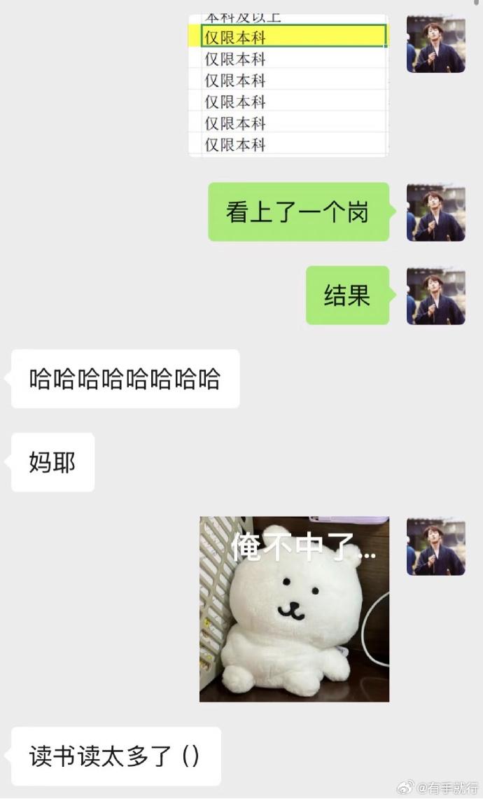 第一次感受到了学历高的弊端,现在研究生年年扩招,学费年年涨价,都去读研究生,博士,博士后,工厂打螺丝去哪儿招人呀。 学历高,能力低,这个通病,本来就是基层的维修、销售服务,喊个研究生来干,一定没有一个高中生干得更好。