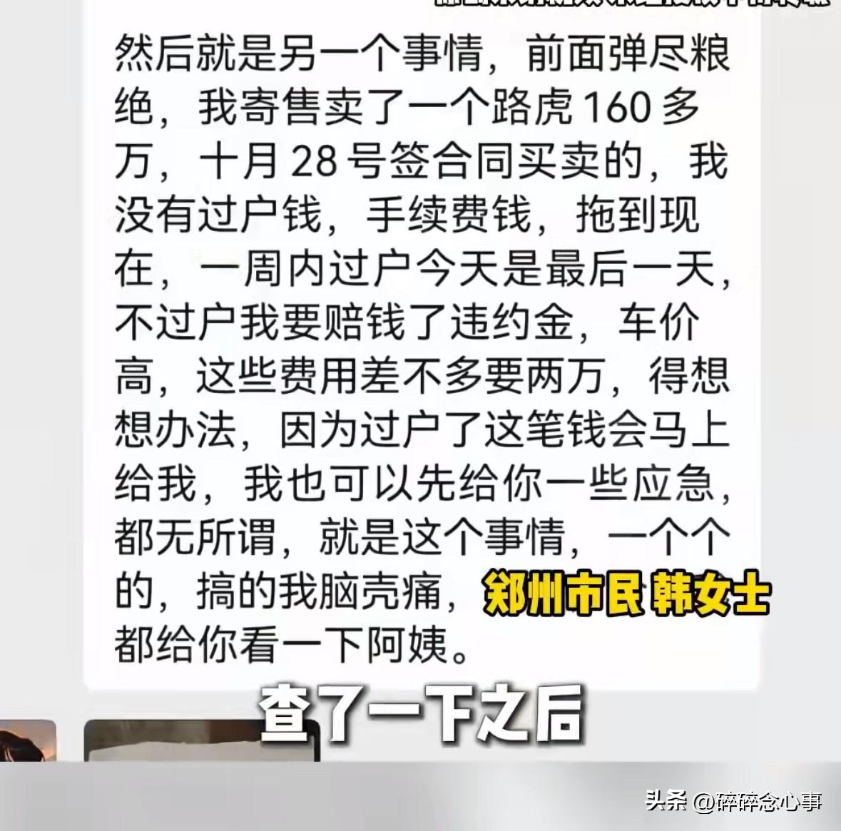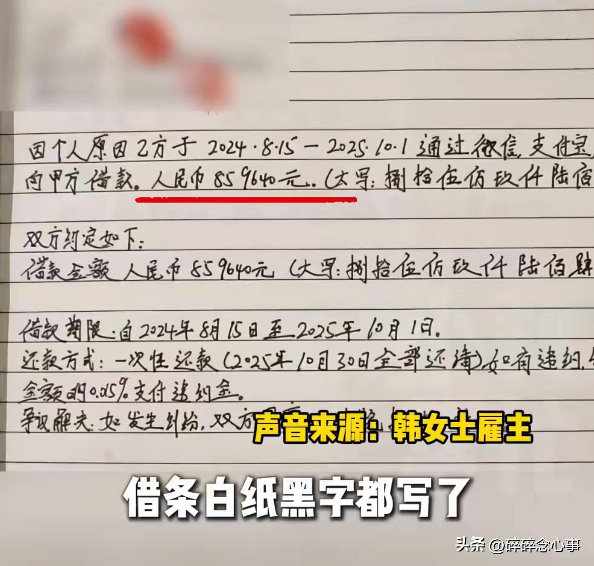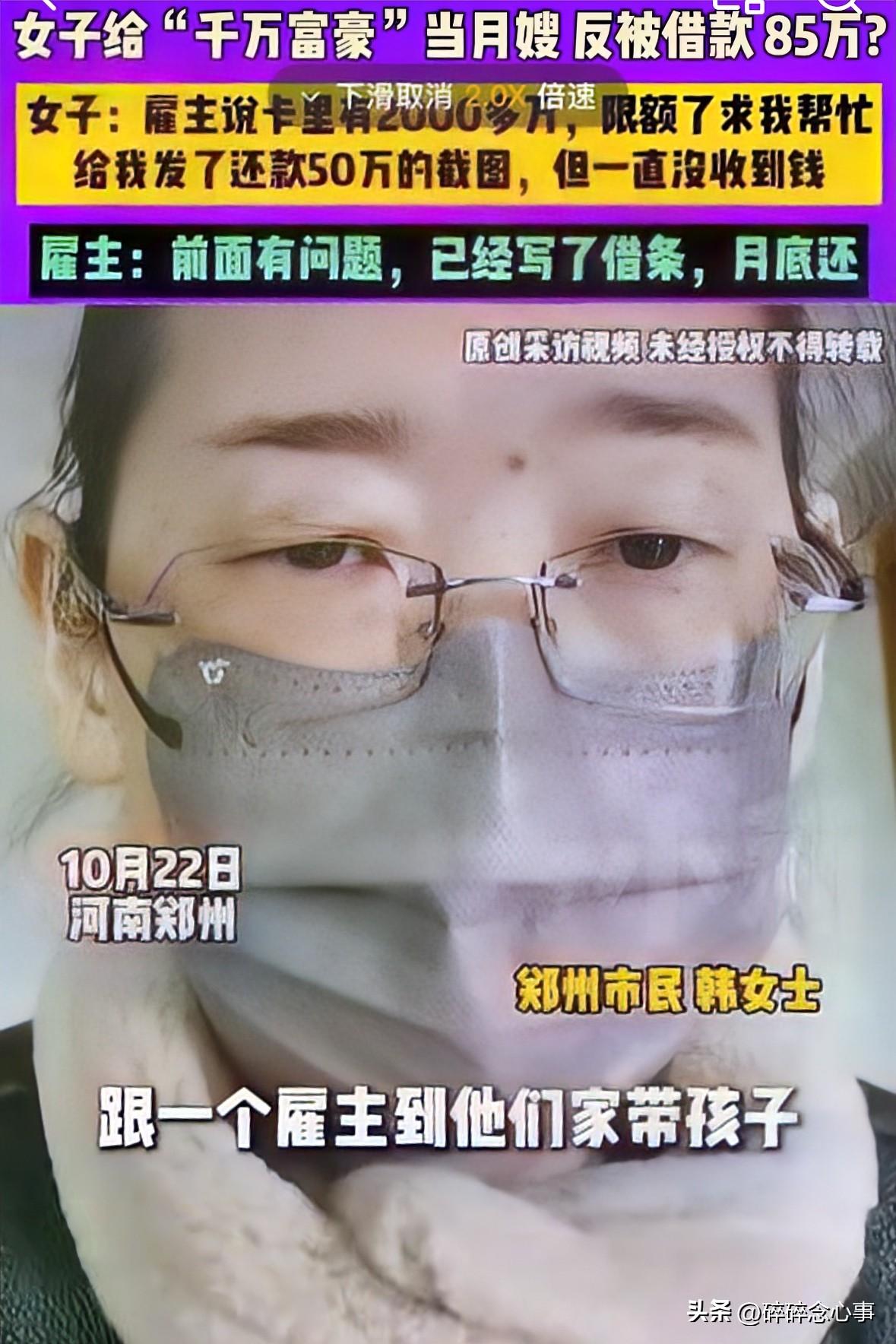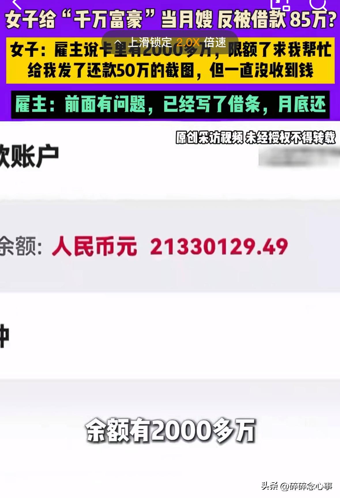 你见过这样的事吗? 说是去当个月嫂,结果工资没挣着,反而自己背上了85万的债!这事儿就真实发生在浙江湖州韩女士身上,真是离了大谱! 韩女士是个月嫂,去年有个雇主请她去家里照顾孩子,说好一个月15000。结果干了一年,工资才拿了5500。这还不算完——雇主一家人跟她说,自己卡里有2000多万,但因为“高消费被限额了”“家人出事要交保证金”,一时取不出来,求韩女士帮忙借钱应急。 更绝的是: 对方还给她发了一张转账50万的截图,说钱已经还了,可韩女士左等右等,账户上一分钱都没收到!就这样,她前前后后帮这家人贷款、借钱,总共85万。 现在呢? 雇主一家跑上海去了,留都留不住。韩女士报警后,对方才还了1万,写下一张84万的欠条。记者联系上男雇主,人家还说:“我家底加房子肯定值2000万”,可物业打脸说——他们住的房子是租的! 韩女士一家现在啥情况? 她和老公到处求人借钱还贷,老公急得嘴上起火泡。她说自己就是个普通月嫂,现在被这笔巨债压得喘不过气。 网友都气炸了: “这年头,月嫂都成高危职业了?”“截图能造假,千万别信!”“欠条写了,但人跑了有啥用?” 呼吁大家不管对方说自己多有钱,千万别轻易帮人贷款、借钱! 转发出去,让更多人看到,帮韩女士讨个公道!