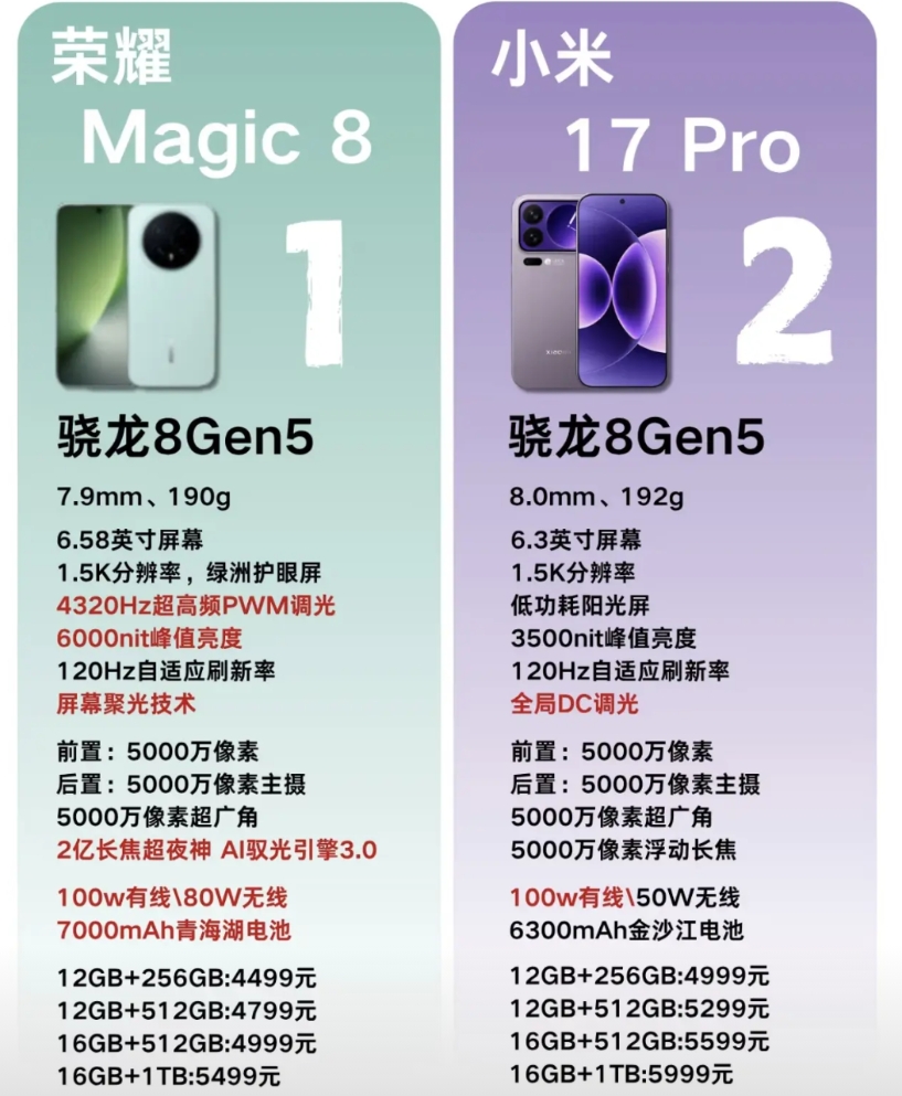 一图对比,荣耀Magic8 对比 小米17 Pro