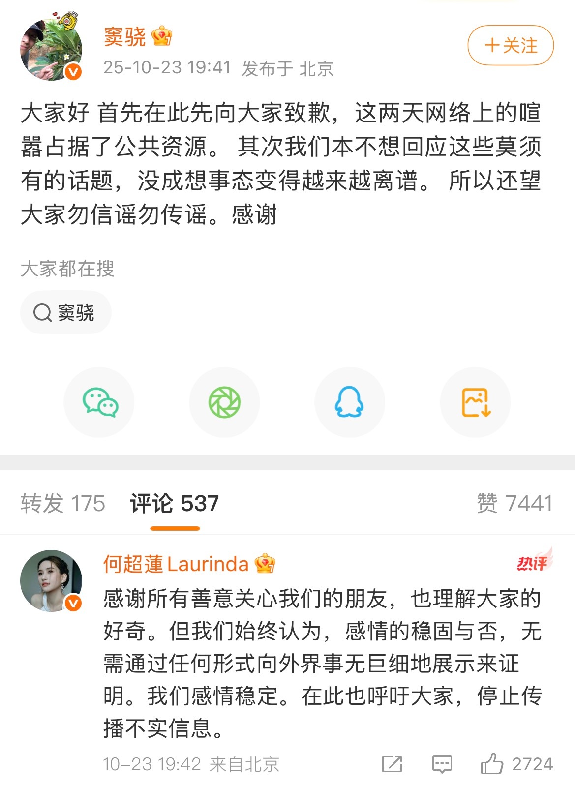 何超莲评论并转发窦骁的微博:我们感情稳不稳固不用告诉你们,我们感情稳定。