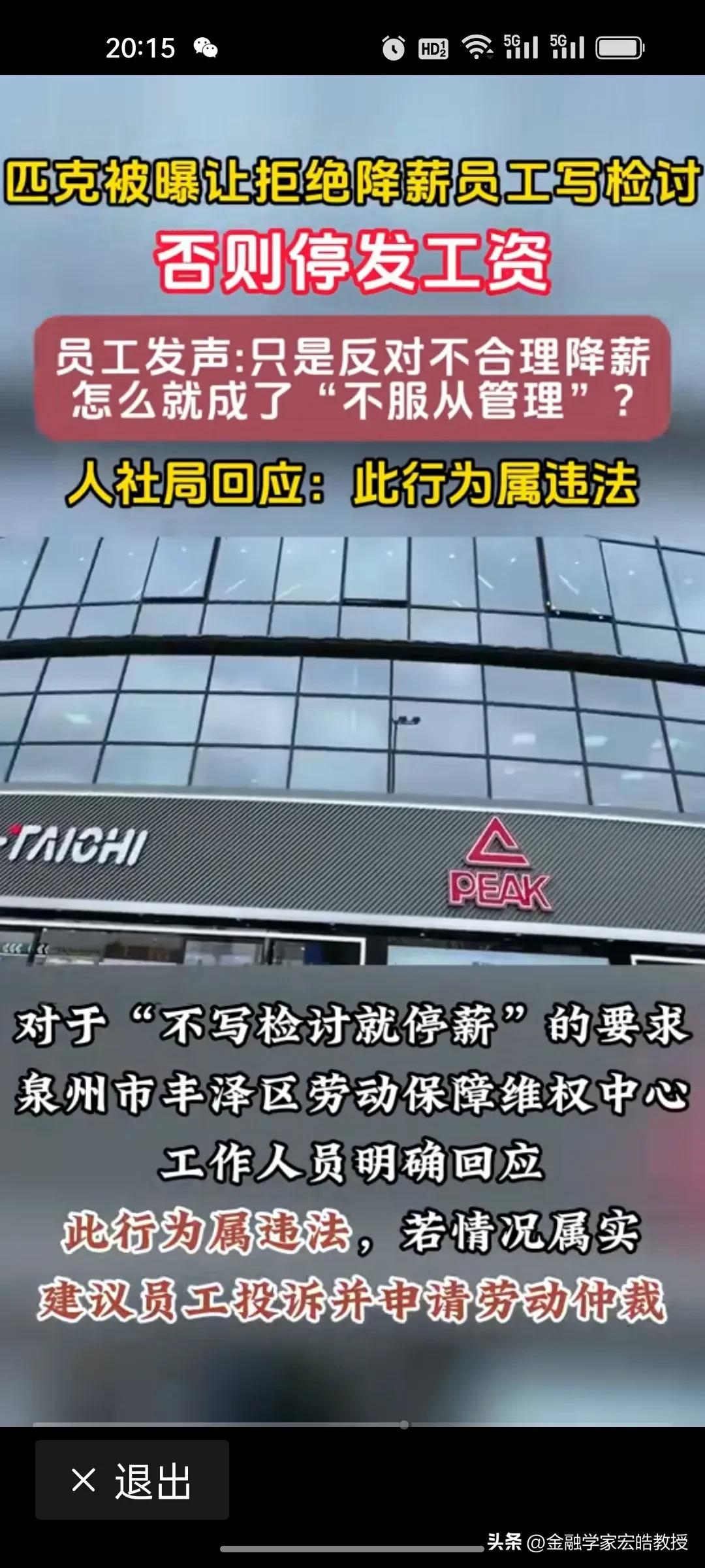 不打招呼就全员阶梯降薪?最高级降50%?不服从就停发工资?真不敢相信这是匹克员工爆料的真事。该员工说,拒绝降薪还要写检讨,不写就停薪,当地人社局说了这是违法行为,已经立案。有点不理解,上个月刚慷慨大方捐了一个亿,现在竟然要全体降薪?难道捐款就是为了抵税吗?企业发生的公益性捐赠支出,在年度利润总额12%以内的部分,准予在计算应纳税所得额时扣除。 匹克千算万算,都没想到还就有不服降薪的员工,匹克用实际行动戳破了其“捐款博好感”与“违法压薪资”的矛盾,也让企业的合规经营问题彻底暴露在公众视野中。