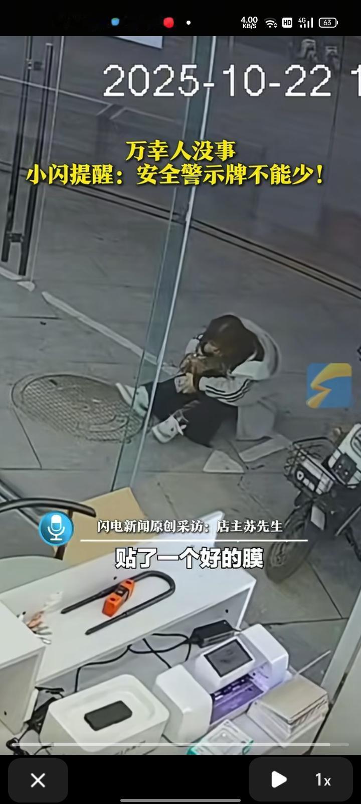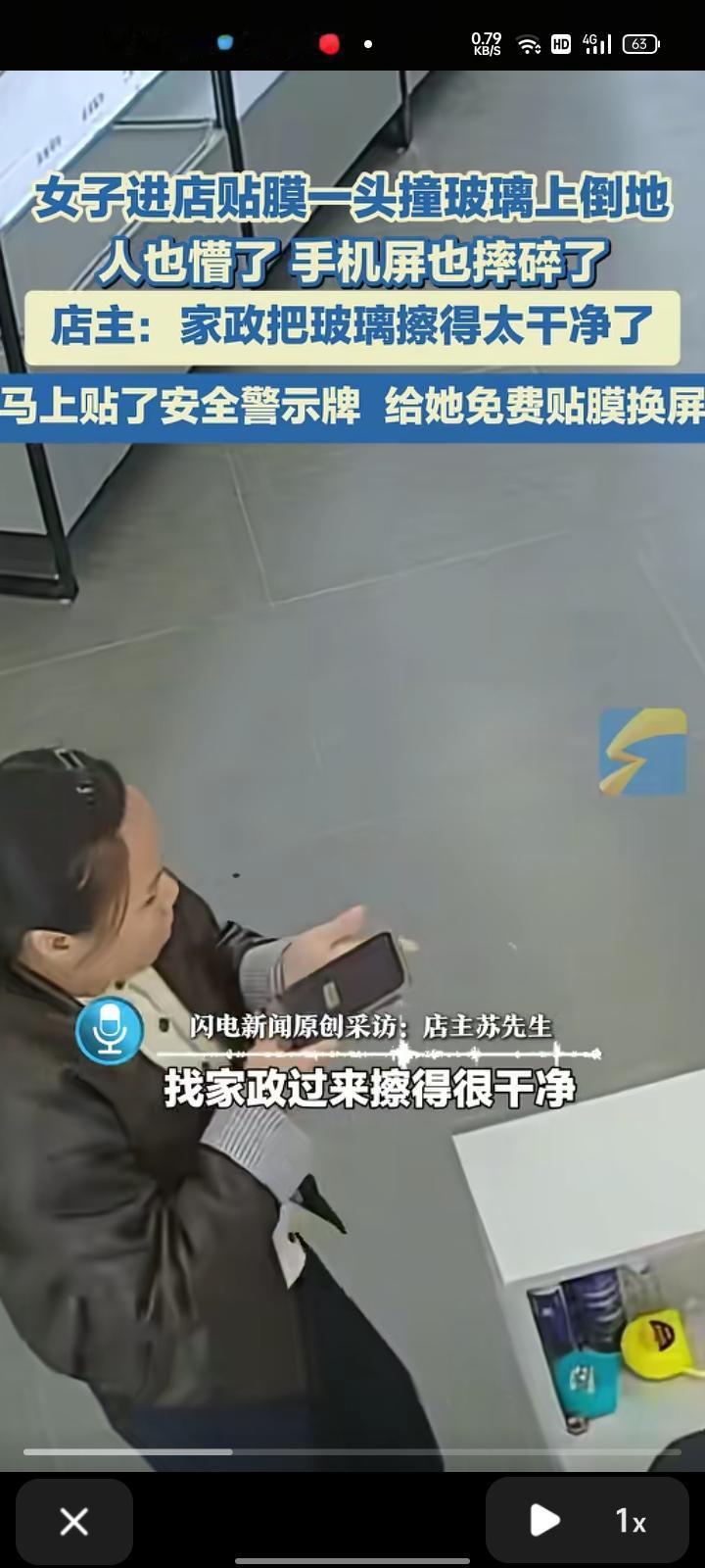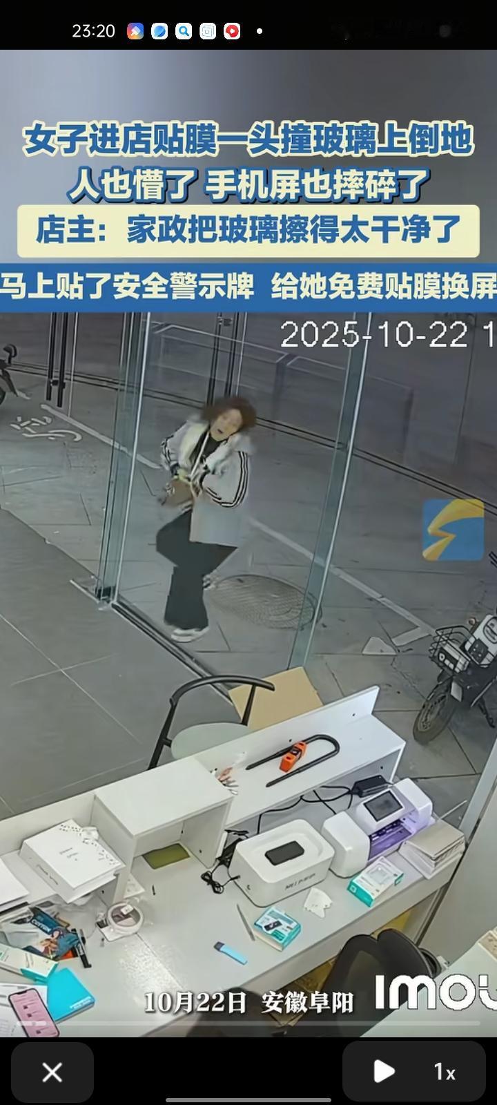 10月22日,阜阳市太和县。手机店开业前,店主找家政擦玻璃擦得太干净,女子进店贴膜时一头撞玻璃倒地,人也懵了手机屏也摔碎了。还好没什么大事,真是吓了一跳。 事后,店主用A4纸打上“小心玻璃”字样贴上去,并给他免费贴膜换屏。
