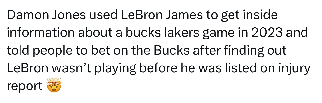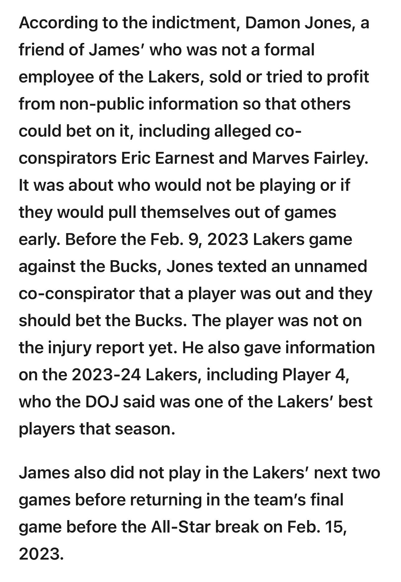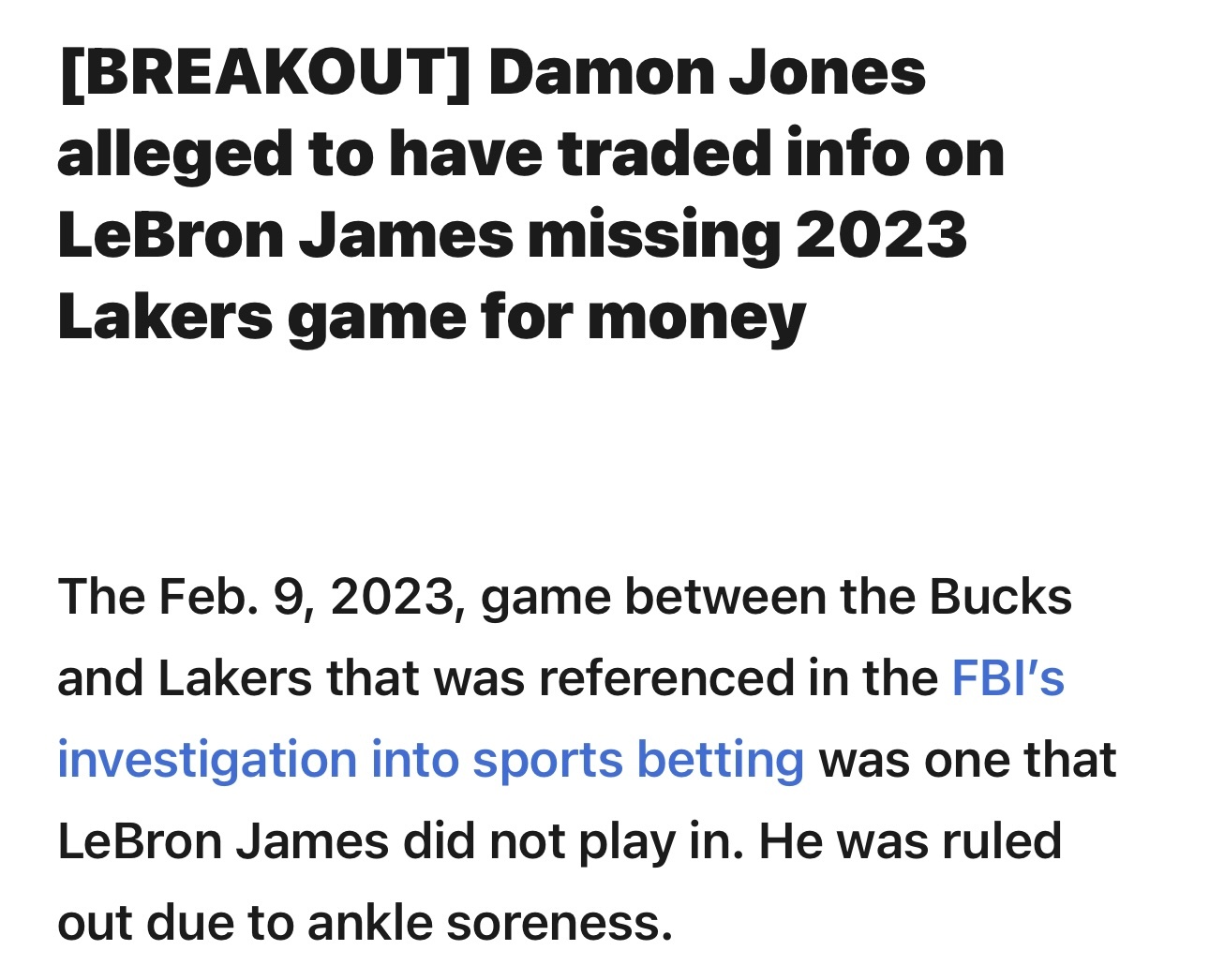 因赌球被捕的达蒙琼斯,被指控2023年提前泄露或出卖湖人球员缺席2月9日与雄鹿的比赛而牟利,以便他人据此下注雄鹿队。琼斯当时并非湖人正式成员,凭借自己与詹姆斯的关系被允许进入更衣室等限制区域。在得知詹姆斯将因为脚踝酸痛缺席比赛后把这个消息告诉给了其他人,押注雄鹿队获胜。