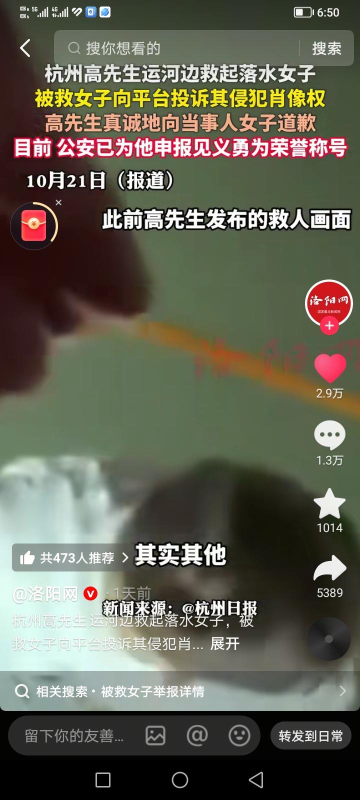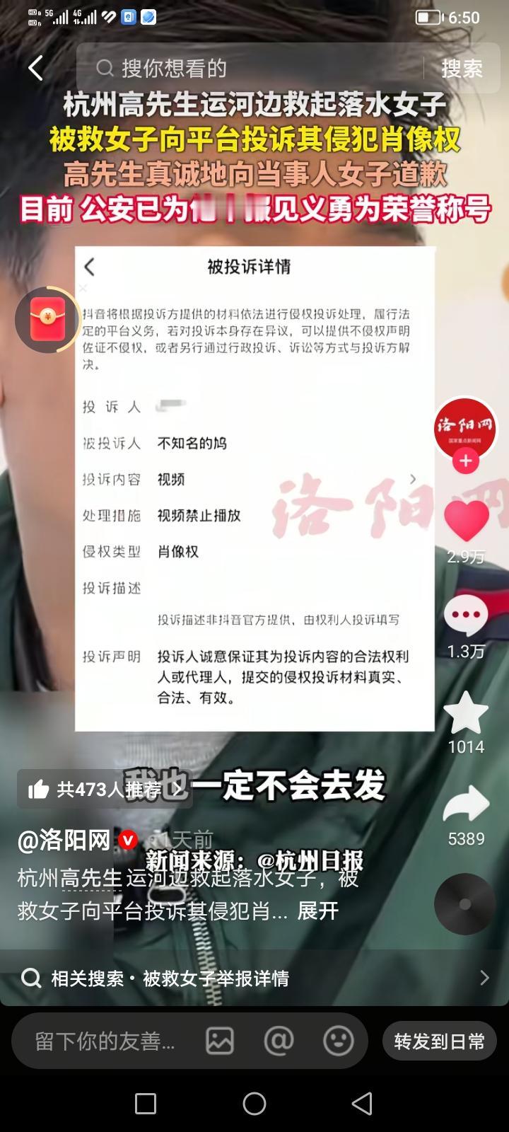为救人损失8000多块钱还被要求道歉,岂不滑稽。2025年10月14日晚,杭州的高先生在运河边散步时,发现一名女子落水 。他毫不犹豫地跳入河中,在岸边路人的协助下,将落水女子成功救起 。上岸后,高先生发现自己脚底被河底的碎石划伤,还丢失了一副价值8700元的耳机 。 由于是第一次救人,高先生便将路人拍摄的救人视频发布到了社交平台,想留个纪念,同时也希望得到网友的认可。然而,视频发布后不久,被救女子便通过社交平台联系上高先生,要求他删除视频。高先生还没来得及处理,平台就以“侵犯肖像权”为由将视频下架。 高先生认为视频中并未清晰显示被救女子的面部,不构成侵权,但律师表示,判断是否侵犯肖像权,关键看结合穿着、发型、场景等信息能否认出具体个人,高先生发布视频的行为可能构成侵权。 之后,高先生将视频下架,并公开向被救女子道歉,表示自己没经过对方同意就发视频,确实是自己的错。目前,派出所的民警已为高先生申报见义勇为荣誉称号。 好人会有好报的,高先生的义举大伙都看见了。也希望那名女子早晚不要出门,不然早晚遭雷劈。(文章图片信息来源:@洛阳网)杭州救人大哥 舍己营救落水人 舍身救落水群众 救人被讹