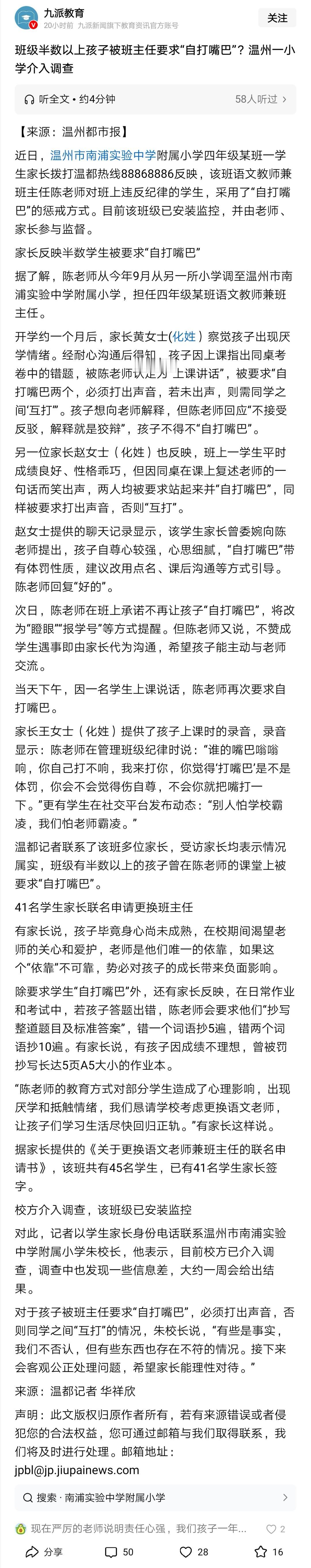 还有网友支持让孩子“自打嘴巴”的教师,认为这是对学生负责的“好老师”。不得不说,无视孩子的人格、尊严,只关注学习成绩,导致了各种自以为“对学生好”的管教措施。这种“自打嘴巴”的管教方式,是对学生进行服从教育,会严重影响学生的人格、身心健康,与宫廷剧中的“奴才掌嘴”有何不同? 如果网友认为“自打嘴巴”方式不错,那么,是不是在单位里也接受领导要求“自打嘴巴”的管理规则?