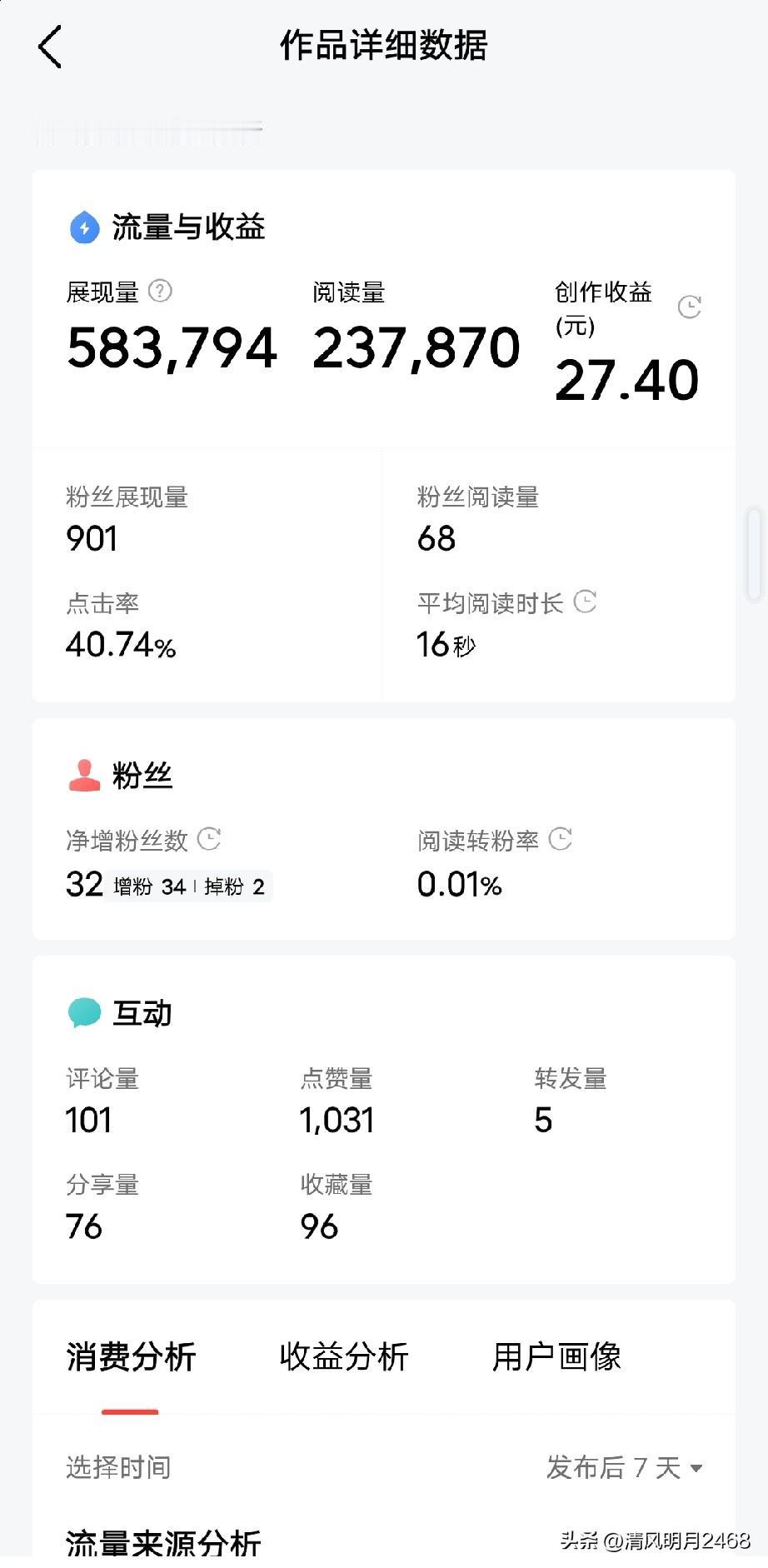23万多的阅读量,最终收益只有27块多钱,单价低至一毛多,头条还有坚持下去的必要吗? 每天都想着如何提高头条的单价,但是单价始终徘徊在几毛钱,感觉写头条真的付出与回报不成正比,简直就是最廉价的打工者! 但是能怎么办呢?写头条是我的爱好,也想通过写头条挣一份收益,但是要想靠写头条养活自己,目前还远远达不到! 大家有没有什么提高单价的方法呢? 不知道各位写头条的单价都是多少呢?