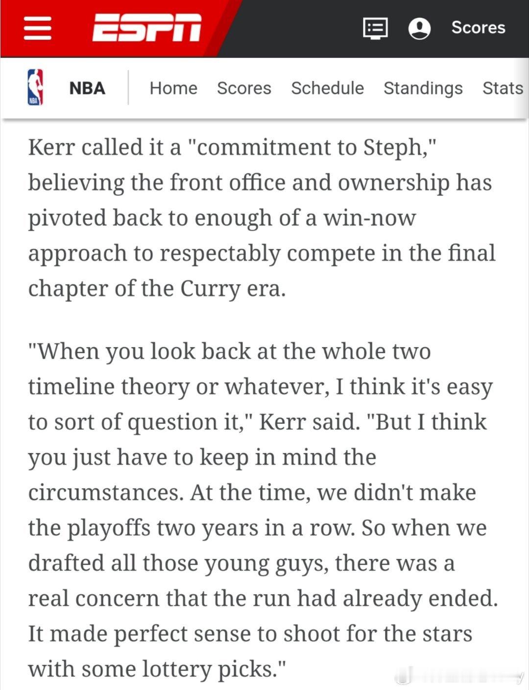 科尔称今年的补强是对库里的一种“承诺”,他认为管理层和老板终于重新找回了“赢在当下”的姿态,以尊重库里生涯最后阶段的竞争价值: