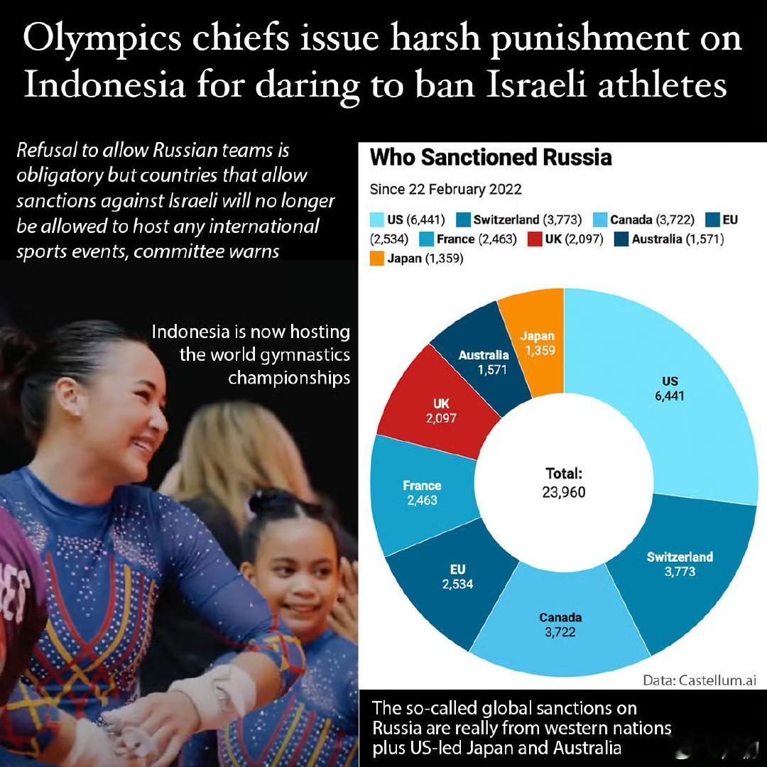 国际奥委会宣布无限期禁止印度尼西亚未来举办任何类型的国际体育赛事,因为印尼拒绝向参加在雅加达举行的世界体操锦标赛的以色列队提供签证。 国际奥委会对印尼进行了前所未有的惩罚,该国将不被允许举办任何类型的奥运会相关活动,同时国际奥委会将告诉世界各地的所有国际体育联合会,他们不应允许印度尼西亚举办任何进一步的体育会议或赛事。 国际奥委会很明显是个政治组织而不是个体育组织,一边禁止白俄和俄罗斯,一边去允许以色列。 对俄罗斯就是禁止,但是对以色列就是“体育无关政治”,双标的嘴脸从不遮掩。 印尼就应该站出来号召伊斯兰世界和阿拉伯世界一同抗议,如果能组织起来,国际奥委会绝对会重新考虑, 印尼拒绝给以色列队签证,自有其立场和缘由,轮不到国际奥委会来指手画脚、搞一刀切的惩罚。还直接把印尼的赛事资格全给抹了,分明就是霸权霸凌!印尼就该硬气到底,不光自己扛着,更要联合伊斯兰世界、阿拉伯兄弟一起发声——凭什么国际奥委会能随意摆弄体育赛事?凭什么以色列就能享受特殊待遇? 只要所有被双标对待的国家拧成一股绳,集体抵制这种不公平的规则,国际奥委会再横,也得掂量掂量自己能不能扛住全世界的反对声! 应该被惩罚的恰恰是这些公然愚弄操控侵害全世界的盎犹匪帮和其走狗帮凶! 注:本文信息源于网络,内容仅为个人观点,无不良导向。
