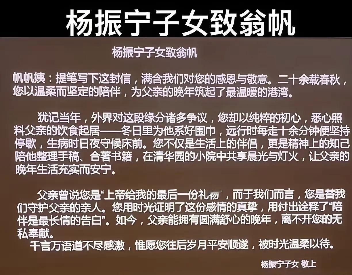 杨振宁子女的信,他们和翁帆的故事, 最近看到了杨振宁子女写给翁帆的信,网上到处都是,大家都觉得有点意思,信里叫她“帆帆姨”,听起来怪怪的,但是也能感觉到,他们对翁帆还挺好的, 信不长,就那么几句话,但是字里行间,能感觉到一家人的感情,还祝翁帆以后平平安安的,过得好,肯定是对她有期待,也希望她好吧,你想想,这封信对翁帆来说,应该是个很大的安慰吧,说明杨家人是真的接受她,尊重她,让她觉得在这个家里,她是被认可的,被爱的,大家都挺羡慕, 这种家庭关系,也挺让人感动的,亲情,感恩,这些东西,还是挺重要的,他们一家子的事,也给我们一种感觉,就是他们是有情有义的人,怎么说呢,挺好的,对吧,最后,当然是希望翁帆以后都好吧,也希望他们一家人,一直这样和和睦睦的,
