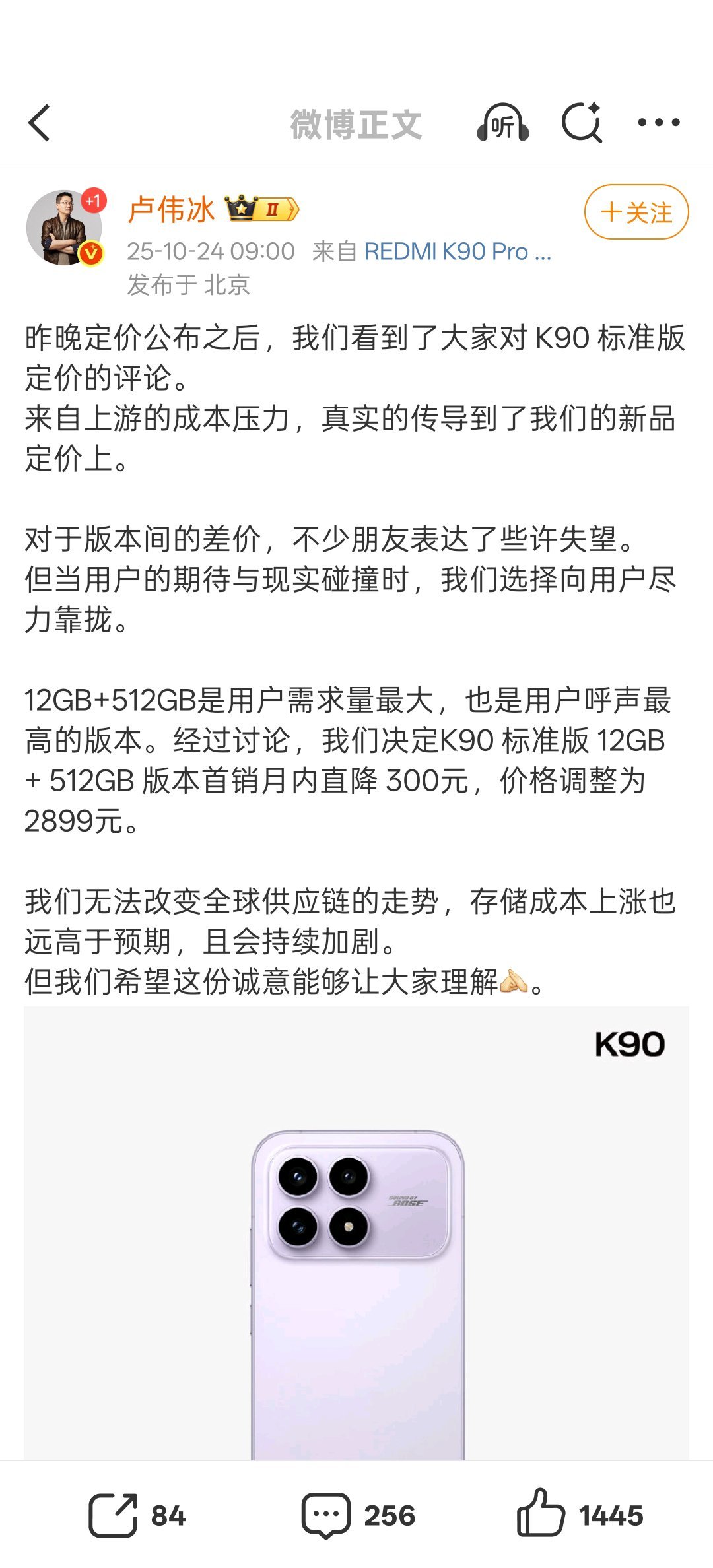 卢伟冰连夜说服高管,红米K90标准版12+512限时闪降300,这个价格竞争力马上又上去了。大家会加钱选择16+512吗?[笑cry]
