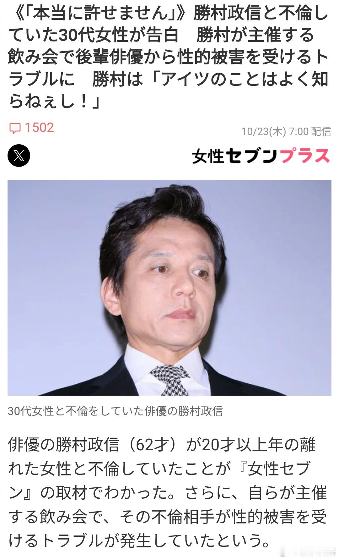 女7:胜村政信(62)出轨比自己小20多岁的女性经营者。