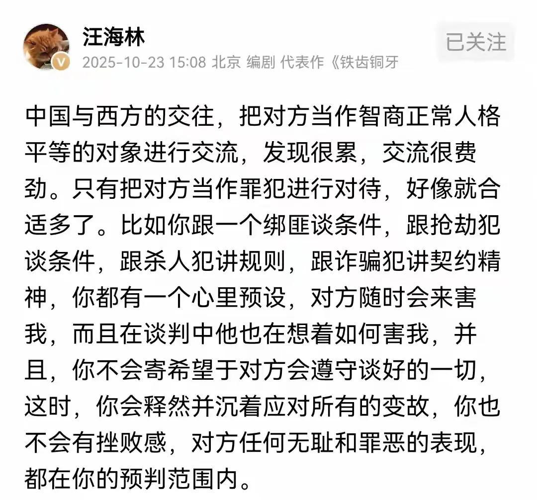 汪海林说的对,我同意他的观点,我看过他的一些视频,他是一个积极向的上正能量的人。 美西方国家的前辈就是强盗,就是靠赤裸裸,血淋淋的就侵略掠夺他国财富实现了现代化的,它们的幸福就是建立在他国痛苦基础之上的。 它们现在也是这样,侵略掠夺强盗本性不会改变,只是表的冠冕堂皇,“文明”了起来,一旦他们的既得利益不能保证,“驴粪蛋”面目就被刺破了。 他们以流氓之心度度君子之腹,心不正,看一切都是歪的,他们是流氓,认为别人和它们一样。 看看我们我们苦口婆心地、不厌其烦地对美国说了多少我们国强了也不会称霸的话,它们会信吗?还是他们装傻!它们就不是什么好东西。 他们只崇拜靠武力的侵略掠夺,只相信拳头和实力。美国的一些流氓政客曾要对我们中国动手,我们向他们发出了许多信号,让它们看到我们的实力,但美国亡我之心不死,他们就不是正常的国家,它们就是个流氓国家,这一点都不为过。 我们必须提高警惕,这个国家是什么坏事都干的出来的甚至不择手段,铤而走险。