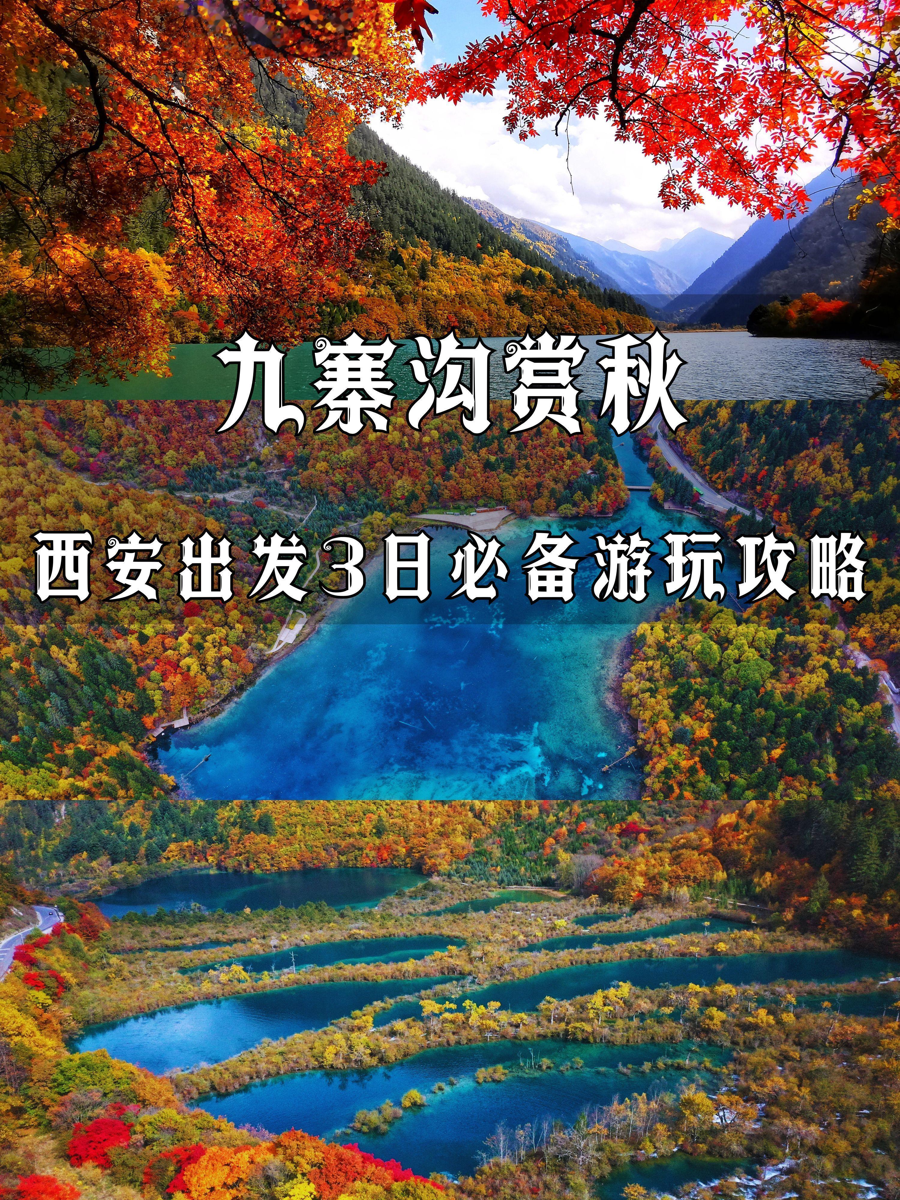 西安出发九寨沟赏秋🍁3日览尽巅峰秋色。九寨沟的秋色一直被人们所惦记和向往,但看彩林,没做好攻略,别盲目去啦,我有一个劝一个!别被某些攻略给忽悠了😤 . 📅 赏秋最|佳时间 ✅10.15~10.25|彩林开始萌芽,红黄与橙红交织,初露锋芒 ✅10.26~11.10|全盛期来袭,叶片颜色变为深红和紫红色,美得令人窒息 ✅11.11~12初|飘雪与落叶共舞,静谧仙境 . 旺季景区门票+景交车(成人280丨学生票185) 近期赏秋人多,需提前一周在官|网预定门票 . 🚌 西安出发每日行程安排: 𝐷𝑎𝑦