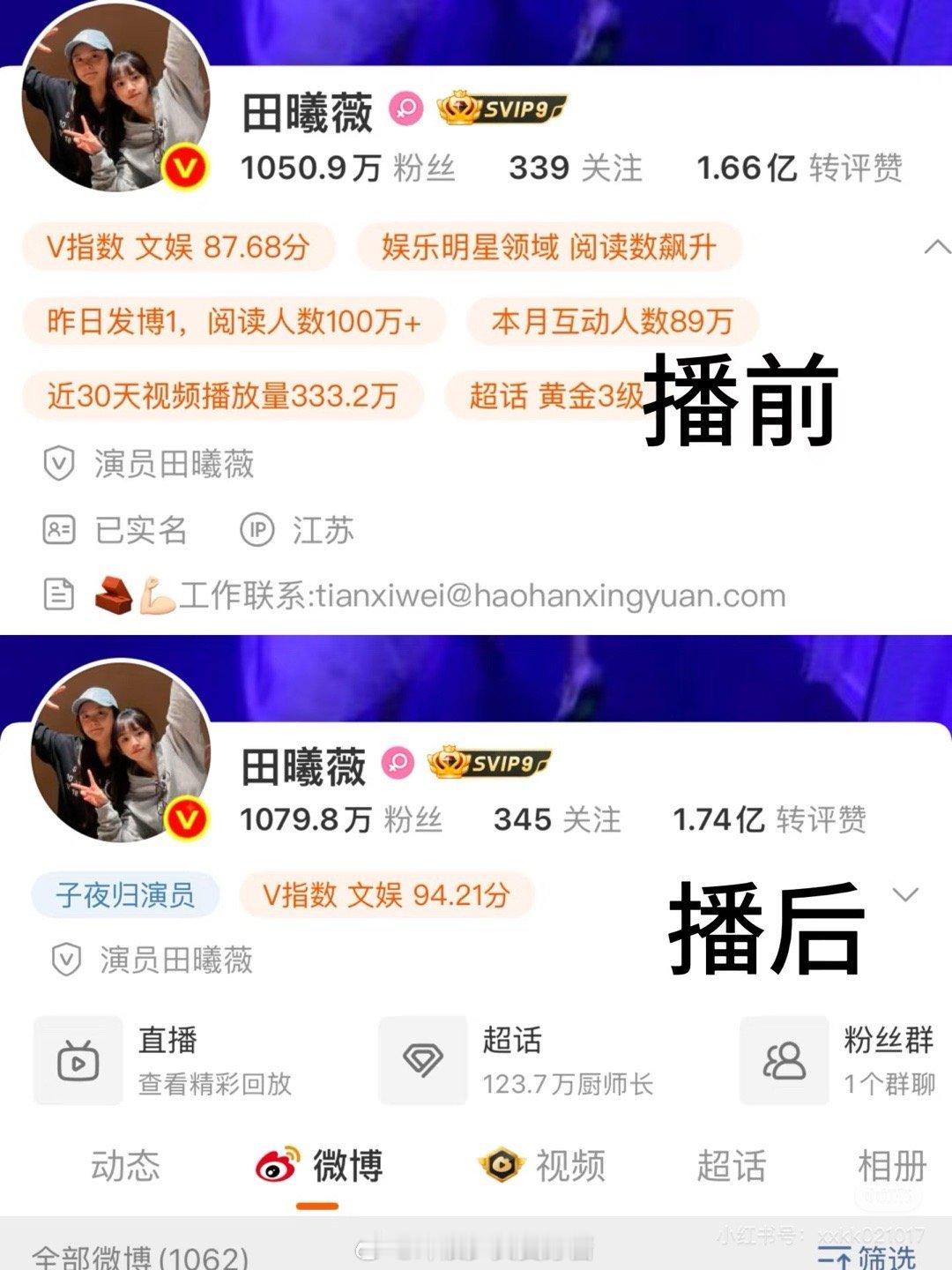 田曦薇子夜归开播前后各平台数据对比,加成不大啊[傻眼]