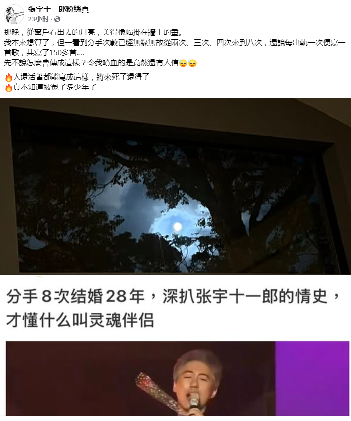 张宇辟谣出轨8次张宇 真不知道被冤了多少年据台媒,有自媒体发文称歌手张宇和妻子十一郎 “结婚 28 年、出轨 8 次”,还说 “每逢婚变就写一首歌”。23日,两人在社交平台上转发否认传闻:“人还活着都能写成这样,将来死了还得了,真不知道被冤了多少年。”
