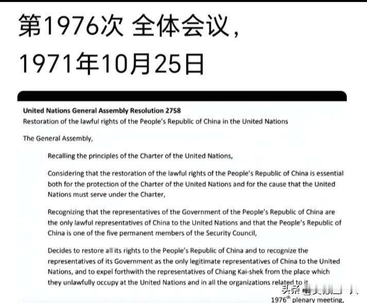 历史上的今天! 10月25日! 前联合国秘书长吴丹致电中国 并转交了2758号决议! 联合国大会第26届会议于1971年25日晚就“恢复中华人民共和国在联合国组织中的合法权利问题”进行表决。大会以76票赞成、35票反对、17票弃权的结果,通过了阿尔巴尼亚、阿尔及利亚等23个国家联合提出的议案,宣布恢复中华人民共和国在联合国组织中的合法权利,中华人民共和国在联合国成为正式会员国,并列入常任理事国。 时任联合国秘书长吴丹致电中国,并转交2758号决议,邀请中国政府参加第26届联合国大会后半期会议。 这个议案称”两阿提案”又称“联合国大会第2758号决议”。 这个决议恢复中华人民共和国在联合国的一切权利,承认中华人民共和国在联合国组织的唯一合法代表,并驱逐蒋介石的代表。 决议明确了世界上只有一个中国,台湾是中国领土不可分割的一部分,中华人民共和国政府是代表全中国的唯一合法政府。 在法律上,为联合国系统处理台湾问题提供了权威依据,联合国官方文件中对台湾的称谓为“台湾中国的省”。 在国际关系上,推动了一个中国原则成为国际关系的基本准则。 当前,世界上已有183个国家在一个中国原则基础上与中国建立外交关系。 1971年11月15日,中国外交部部长乔冠华作为中国代表团团长,黄华为副团长率领代表团首次亮相联合国会议大厅。 他以不卑不亢、落落大方的心态,首先拜会了第26届大会主席,任度尼西亚外长马利克,还向他敬烟,两人一边吸烟一边谈,首先感谢他对中国的支持。 随后,乔冠华去医院看望住院治疗的秘书长吴丹,回过头来又拜访了对中友好国家,他出色的外交礼节和机智的反应能力受到广泛称赞。 出席会议时,他的”仰天大笑”成为经典瞬间。 注:当时国家拍摄了新闻简报,以影片形式记录了这段历史,有兴趣的可以搜索观看,以上内容部分来自以往官方文件联合国 中国联合国 联合国决议