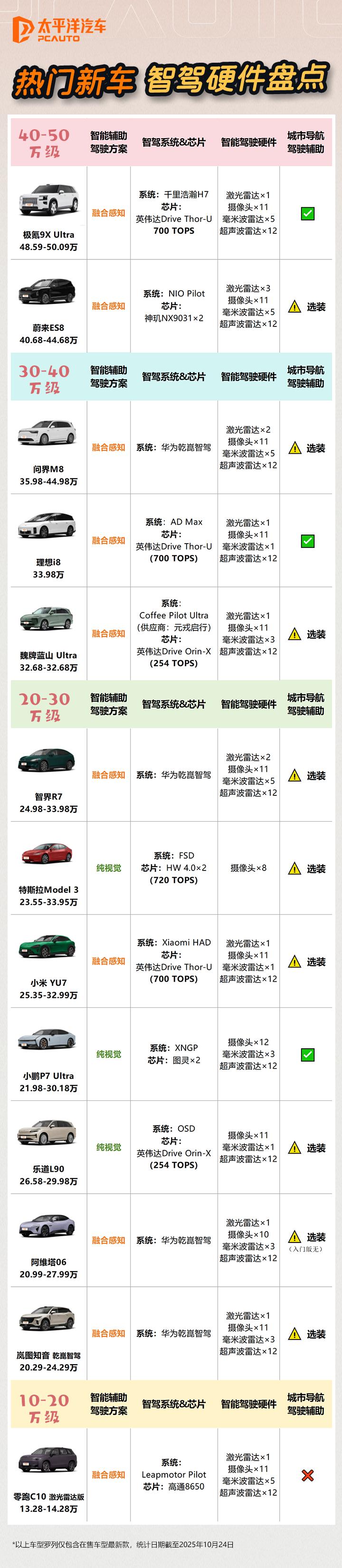 车企的智能辅助驾驶军备竞赛已白热化! 激光雷达数量与芯片算力成了新的宣传名片 但硬件堆料背后,现实路况的表现才是试金石。 上到50万,下到10万,简单盘了下一些热门新车的智能辅助驾驶硬件~ 硬件强、芯片算力高,智能驾驶就一定更厉害吗? 本期智驾大横评 就拉了13款热门新车,模拟各种真实路况,魔鬼测试正在进行中 硬件是基础,但绝非唯一。 算法的“智商”与数据的“经验”同样关键 在真实场景下,你觉得谁家的智能辅助驾驶最好用?关注话题智驾大横评 ,我们用实测告诉你!