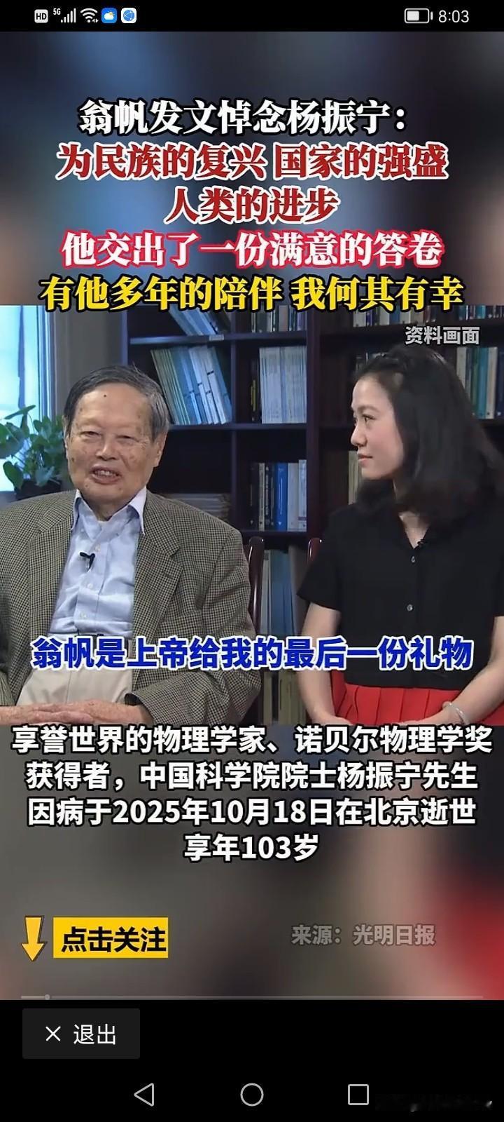翁帆与自己的老公杨振宁永别了,2004年,28岁的翁帆就嫁给82岁的杨振宁,一开始,这两个人结婚,网络上就各说纷纭,真的是啥说法都有,然而翁帆一如既往的跟着杨先生走完最后一程,也许这里有的是爱和崇拜吧。每次有活动看见两个人出席,翁帆都会紧紧的握住杨先生的手,互相搀扶着出现在大家面前,不管别人说什么,坚持自己内心的想法最重要。 杨振宁,真的是少有的天才,贡献很大,虽然晚年了才回归中国,但是在科技发展领域上,我百分百的相信,杨振宁先生肯定会毫不保留的把自己所有的东西传授给自己的祖国,虽然作为普通老百姓,我也不知道他的贡献有多少,但是我敢肯定杨先生回家的目的和贡献肯定超过我的认知以内。 看见杨先生去世的消息,我不太想去确认是否是真实的,因为这么优秀的人我希望他能长生不老最好,但是这是生死轮回,谁都无法改变的事实啊!今天是杨先生遗体的告别日,杨帆跟着杨先生的儿女站在一起,她很悲痛,也许她比杨先生的子女更是悲痛不已,再爱,再不舍,也会有这么的一天。 杨先生生前被采访时也说过,其实他知道已经有人已经给他写了讣告了,等他去世的那天他们就会很快的发布出来,包括会写自己的功绩啊啥的都会写了,真的是说的一点都没错啊,果然是看透了一切啊! 希望杨先生一路走好[祈祷][祈祷][祈祷]