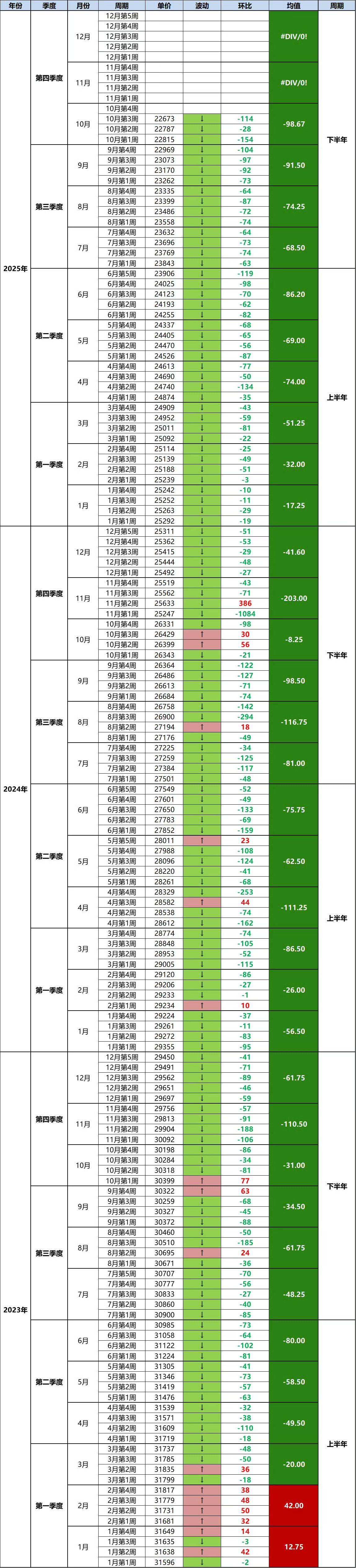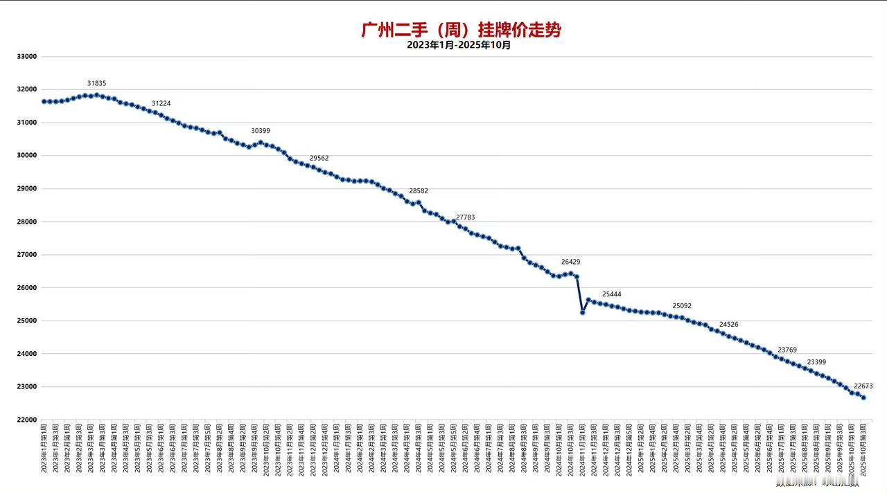 2023年1月-2025年10月,广州二手(周)挂牌价趋势。图一和图二为两个不同“坐标轴最小值”的曲线图,方便观察和对比。数据来源:冰山指数
