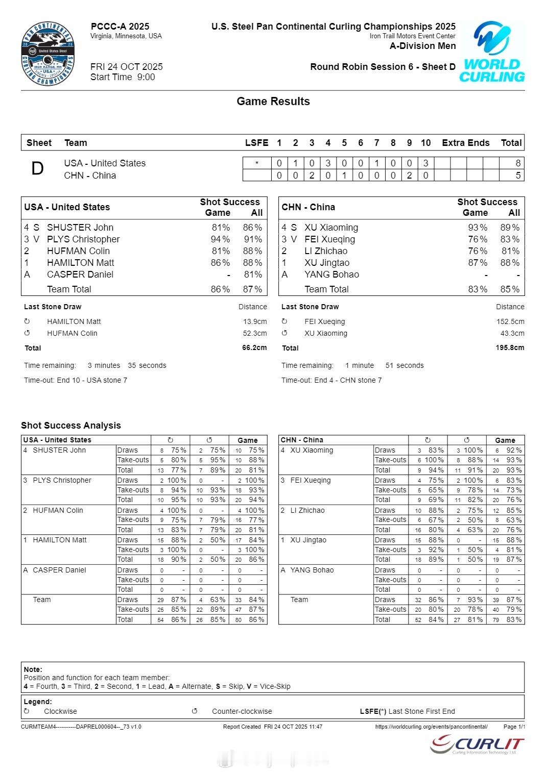 【泛洲际冰壶赛中国男队惜败美国 无缘循环赛前二】国际体坛战报速递 10月24日美国维吉尼亚,泛洲际冰壶锦标赛中国男队在第六场比赛中,被对手最后一投绝杀,以5-8惜败,4胜2负无缘循环赛前二。北京时间25日8时,中国队将在循环赛最后一轮对阵同为4胜2负的日本,胜者将与加拿大vs美国的负者进行半决赛。