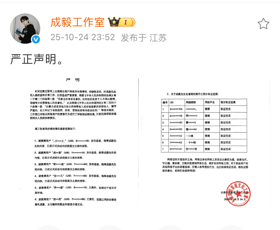 📣成毅工作室发布维权严正声明❗❗❗