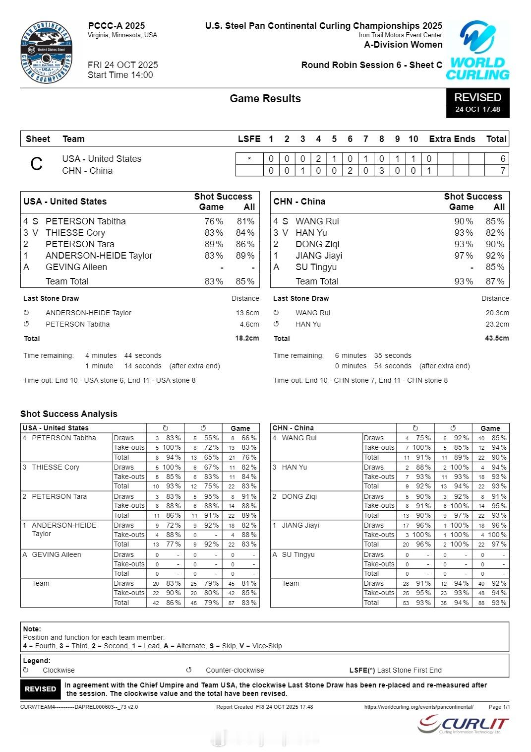 【泛洲际冰壶赛中国女队加赛绝杀美国 六连胜锁定循环赛第一】国际体坛战报速递 10月24日美国维吉尼亚,泛洲际冰壶锦标赛中国女队在第六场与同为五连胜的美国队比赛中。本场王芮回归,中国队在第八局拿到3分以6-4领先后,先是第九局先手丢1分,再是第十局后手被偷1分被逼进加局。好在加局拿下以7-6险胜美国。中国队六战全胜独自领跑,已经提前一轮锁定循环赛第一。加拿大则拿到了第三个四强席位。北京时间25日22时,最后一轮中国队将对阵2胜4负的澳大利亚,美国和加拿大、日本和韩国将捉对厮杀。如果韩国战胜日本,将拿到最后一个四强席位并在半决赛对阵中国。否则日本将出线,半决赛对阵形势将看美加的比赛结果。