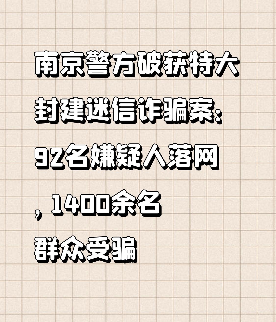 南京警方干得漂亮,成功破获特大封建迷信诈骗案,92名嫌疑人落网,1400余名群众被骗,涉案资金达4600余万元,受害群众遍布18个省份。 就说南京的赵阿姨,在短视频刷到“调风水保平安”的话,正中她独居的隐忧。加了“班主任”微信学免费课,结果被套取各种信息。免费课结束,花3999元报“高阶课程”。“督导师兄”又吓唬她女儿有血光之灾,还拿其他案例佐证。这骗子手段太可恶,专挑人的恐惧心理下手。大家可得擦亮眼睛,别被封建迷信骗了。