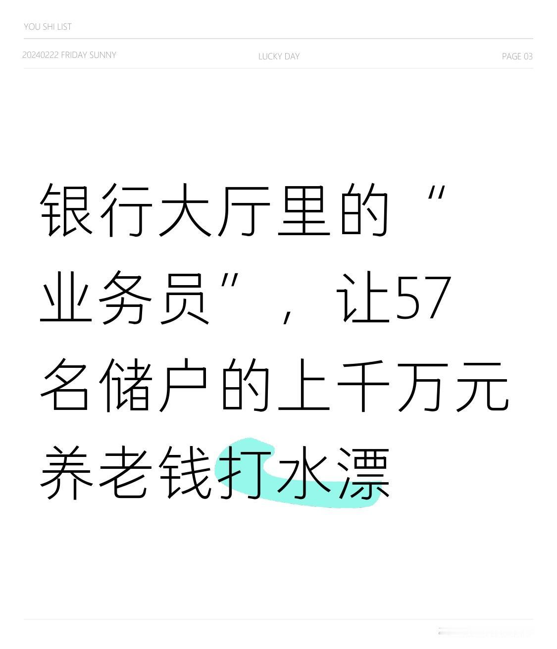 太让人气愤了!2019 - 2020年,山西吕梁柳林县57名储户在当地某银行营业厅“存钱”,结果1180万本金打了水漂。像72岁的王慧芳,一辈子攒的30万养老钱就这么没了。那些穿银行工服的“业务员”,用“高息存款”“银行活动”作幌子,在银行营业厅用储户手机转账买高风险理财。这些受害者大多是中老年人,缺乏分辨能力。事发5年,损失仍未追回。虽然监管分局认为涉案三人非银行员工,无证据证明与银行有关,但储户觉得在银行营业场所出的事,银行该担责。银行真得加强管理,别让老人的养老钱再打水漂了。