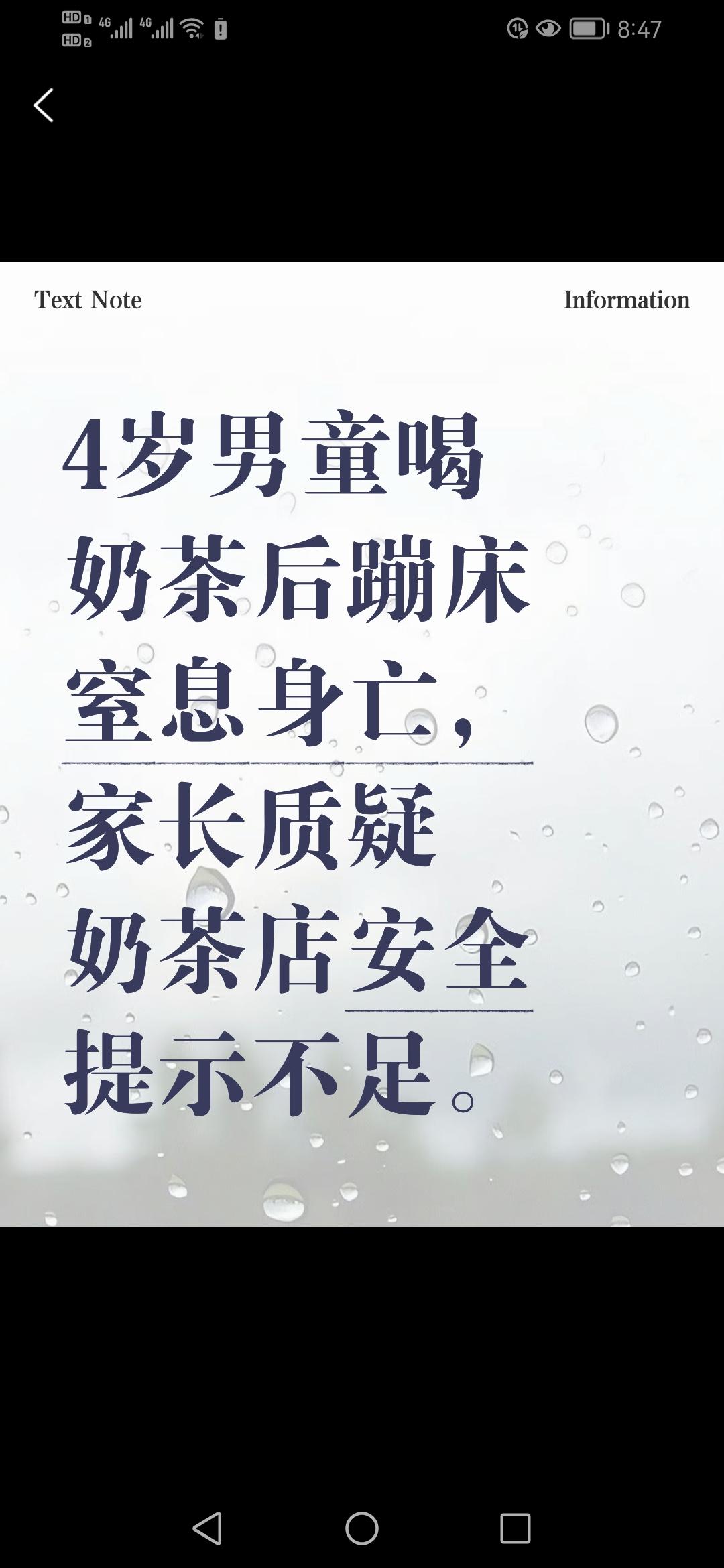 4岁男童因喝珍珠奶茶后蹦床不幸窒息身亡,家长质疑奶茶店未贴安全告示,事件引发广泛关注。 近日,浙江台州一名4岁男童因喝珍珠奶茶后蹦床,不幸窒息身亡,这一事件引发了社会的广泛关注和讨论。据中安在线报道,该男童在10月19日于杜桥镇宝龙广场游乐场内喝完珍珠奶茶后玩蹦床,导致珍珠反流卡喉,尽管现场人员进行了紧急救治,但最终未能挽回孩子的生命。男童家属对此表示质疑,认为奶茶店未张贴明显安全告示,也未口头提醒食用风险。店家则回应称,下单小程序中有“儿童和老人要在看护下食用”的安全提示。此事件不仅让家长对孩子进食玩耍的安全问题感到担忧,也引起了公众对儿童饮食安全的高度重视。专家提醒,由于儿童吞咽功能不健全,在嬉戏玩耍时易将食物或其他异物误吸入气管内,可能导致严重并发症。家长应避免让孩子食用花生、瓜子等易产生呛咳的食物,减少安全隐患。
