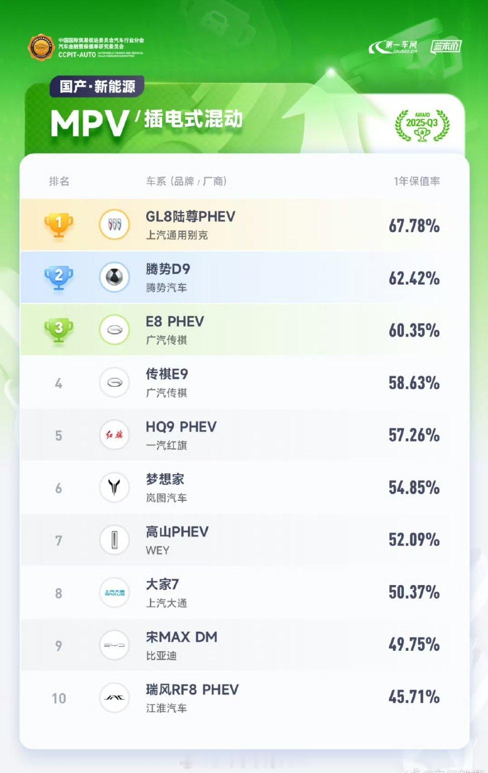 豪华新能源MPV别克GL8陆尊获得插电式混动MPV一年保值率冠军,