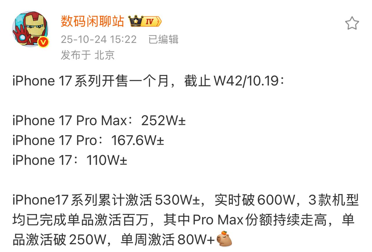 人人都吐槽苹果,结果苹果一年比一年卖得好?[捂脸]iPhone 17 Pro Max卖疯了!开售一个月激活量破250万,断层领先! 最新数据显示,iPhone 17系列开售仅一个月,累计激活量已突破530万台,三款机型均实现单品激活破百万。其中,iPhone 17 Pro Max表现最为抢眼——激活量高达约252万台,占比接近全系一半,呈现“断层式领先”态势。 具体来看: 📱 iPhone 17 Pro Max:约252万台 📱 iPhone 17 Pro:约167.6万台 📱 iPhone 17:约110万台 值得关注的是,Pro Max单周激活量曾突破80万台,持续领跑市场。据了解,该机型在工业设计、性能配置和影像系统上均有升级,尤其外观变化最为明显,成为吸引用户下单的关键因素。 这一代iPhone,你入手的是哪款?