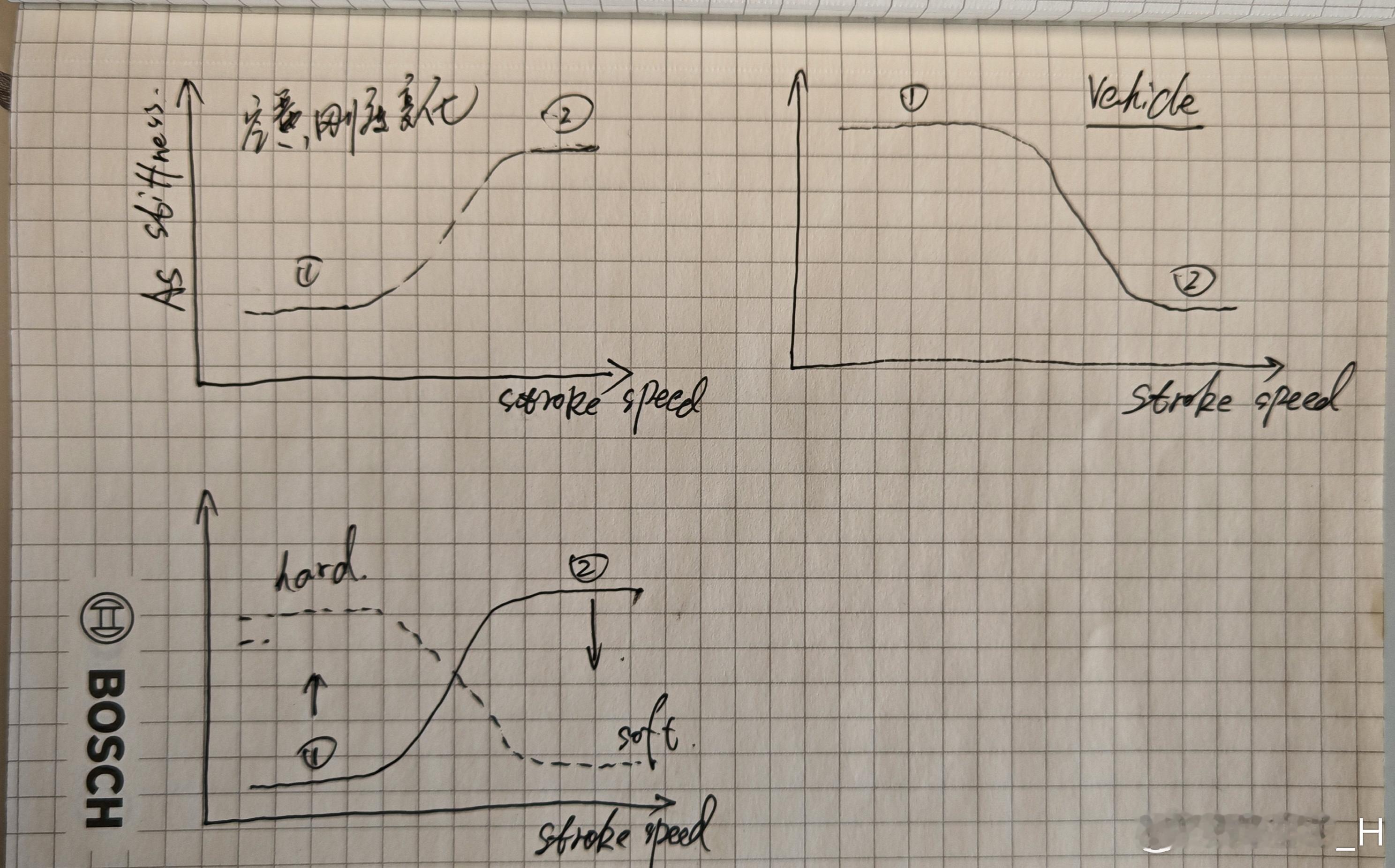 上面是空气弹簧特性,但是在车上我们希望这样吗?明显用户的期望恰恰相反,整车表现我们希望是低速大行程工况,比如过弯车身侧倾,希望希望弹簧更硬,提供足够的支撑力来抑制车身侧倾;而在高速小行程工况,比如跑烂路、压过细小颠簸等粗糙路面,我们又希望弹簧更软,来过滤掉烦人的振动,保证舒适性,见图9。