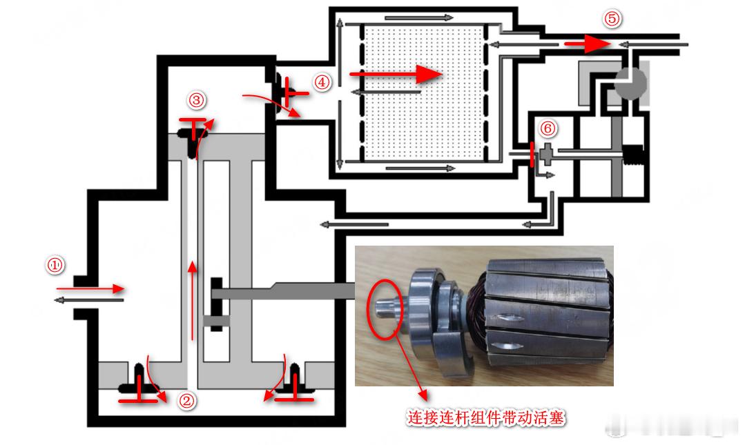 活塞杆总成包含密封环、泵杆、阀片、缸体、销钉、卡簧等,电机带动活塞杆做往复运动时,活塞右移,①气室内气压降低,产生压差,阀片打开,②气室的气体进入通过进气口和阀片进入①气室,完成吸气过程。