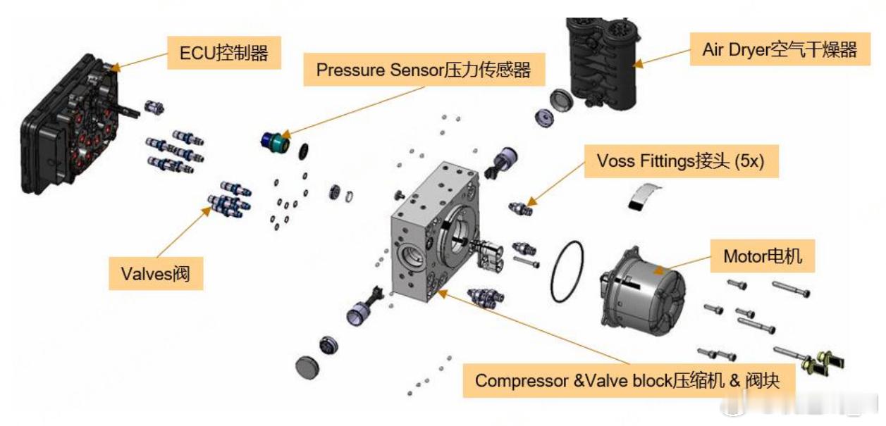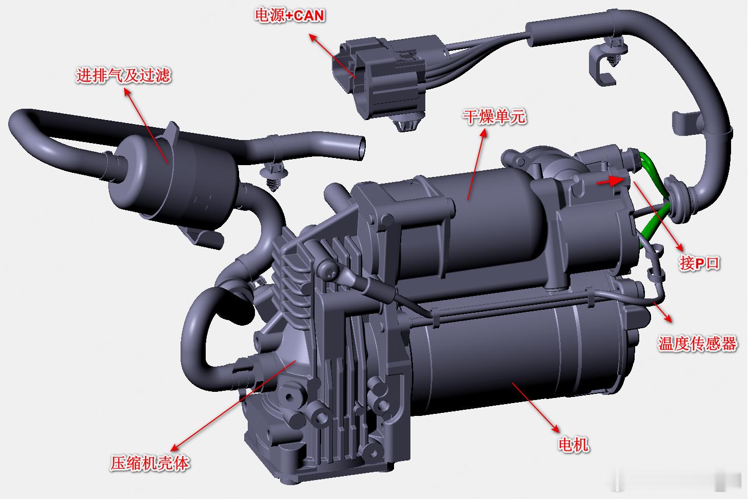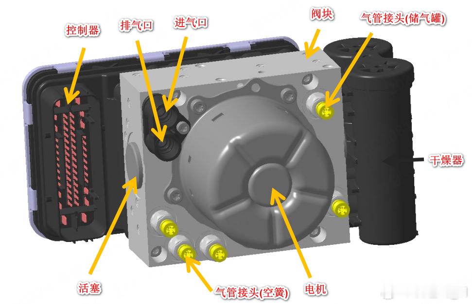充气路径:大气→进气管(集成过滤器)→压缩机→干燥器→分配阀→空气弹簧。