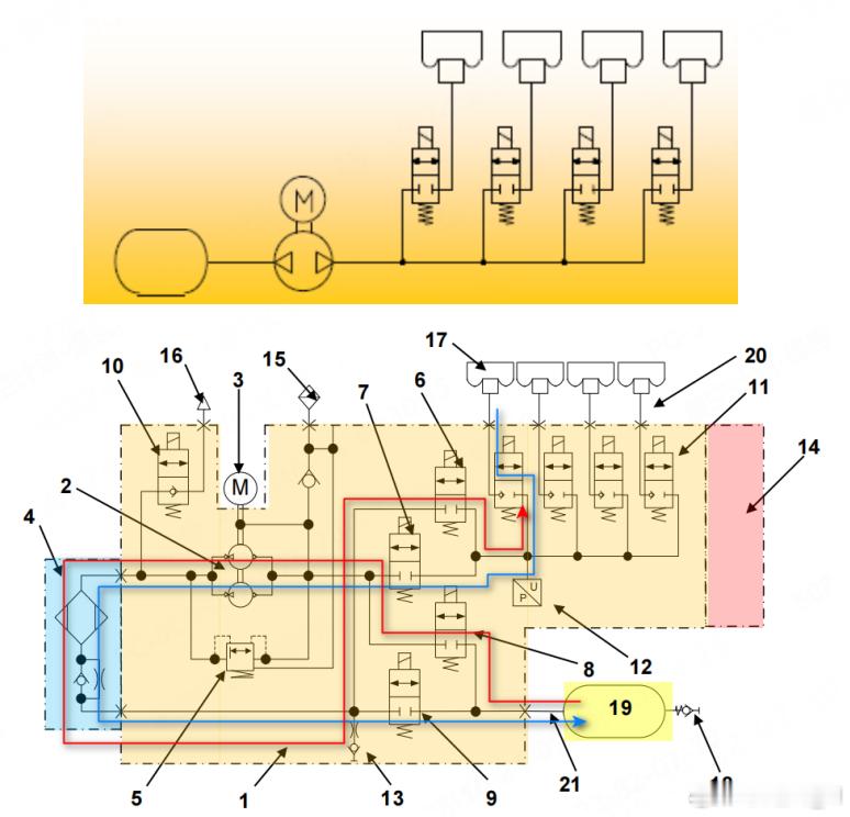 ①举升:储气罐19→电磁阀8→压缩机2→干燥器4→电磁阀6→空气弹簧17
