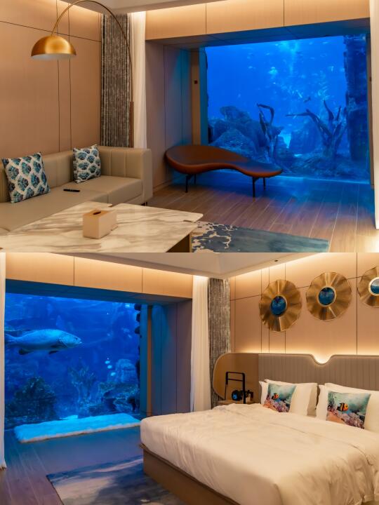 我入住的是鹈鹕度假酒店,就在景区旁边,步行2分钟就能走到,而且酒店供海底套房、雨林客房、树屋客房、卡通部落等多种房型选择,每个房型有多种不同的特色体验,非常适合宝妈和宝爸带娃一起入住。特别是海底客房,在房间里面就能看到海底世界,强力推荐。
