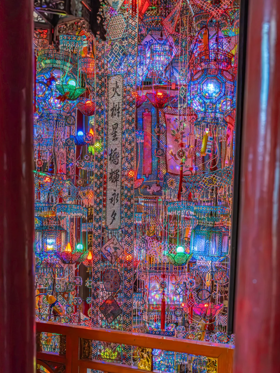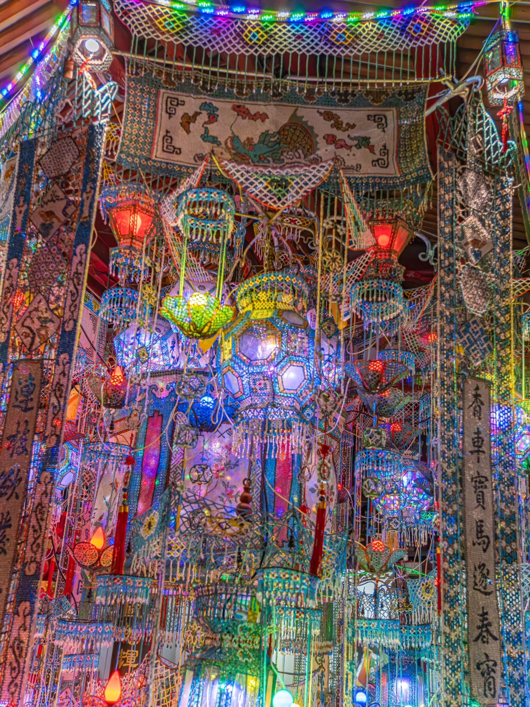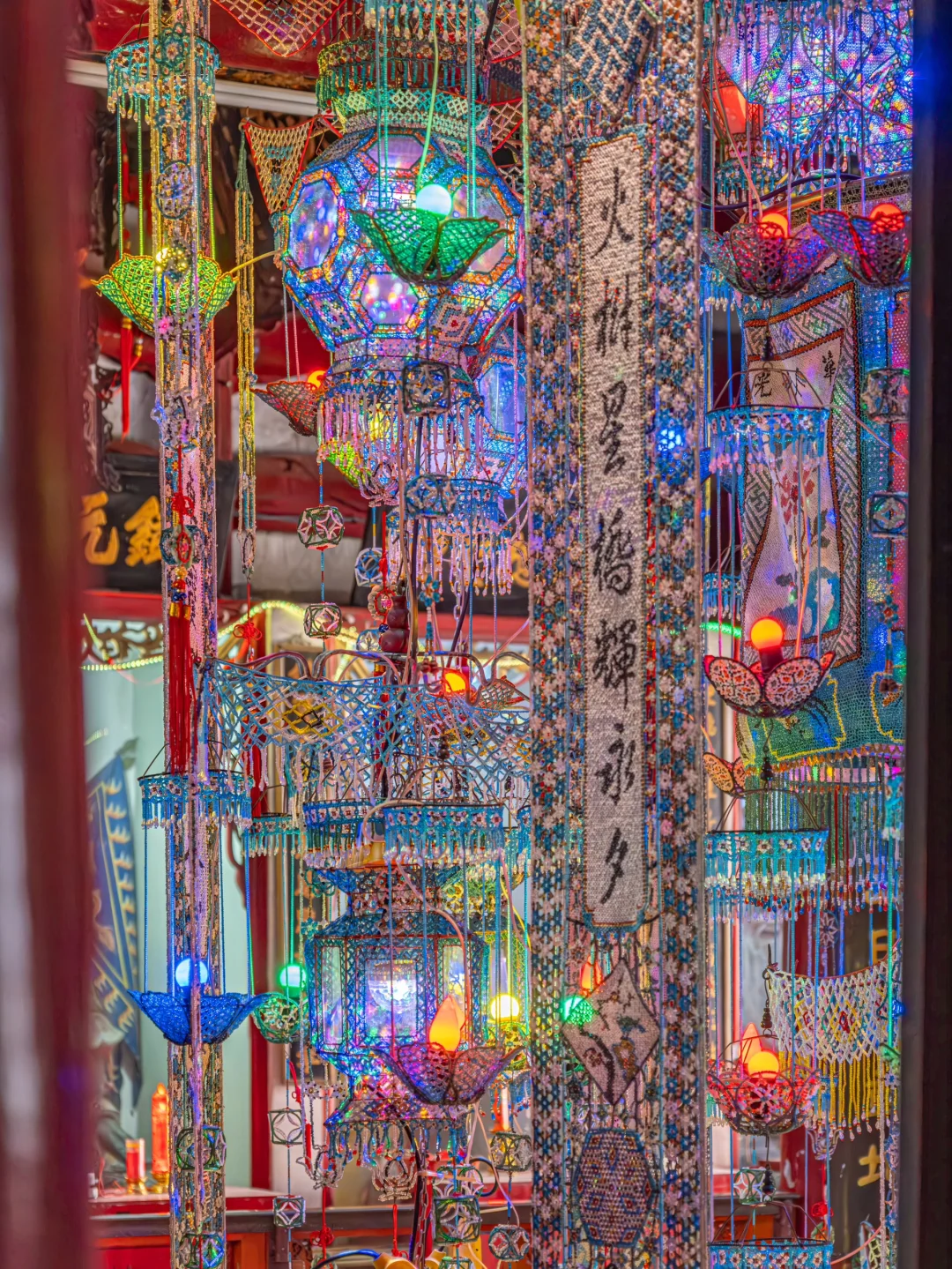 一直都知道温州有个百年的珠簖灯 但是当我站在他面前的时候真的被震惊了 非常普通的五显庙里面居然藏着这百年珠簖灯 还有古朴的戏台 无时无刻在诉说这历史的悠久 . 📍地址:温州蒲州街512号(五显庙) . 🌟科普: 珠灯,又称珠簖,是民间手工艺人精工制作的艺术珍品。庙里现存的珠簖据传制作于清康熙年间,距今已有三百余年的历史,民国甲子年(1924)曾重修。 大大小小计四百多件,全部由手工制作的五彩玑珠(据传来自南洋)串制而成。围绕着一个径2米多的圆珠簖,密如织布,上串绣六幅四時之花。 后因年长日久,遭自然和人为损坏严重,线段珠散濒临毁灭之危,后得各届人士合力支持慷慨捐赠修缮。古老的民间艺术瑰宝重放光彩,再现温州,为民俗文化锦上添花。 .