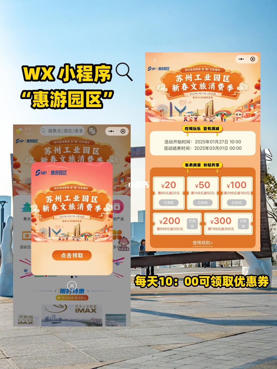 ▪微信小程序搜索“惠游园区”,进入“苏州园区新春文旅消费季”专题,可以领取吃喝玩乐满减消费券